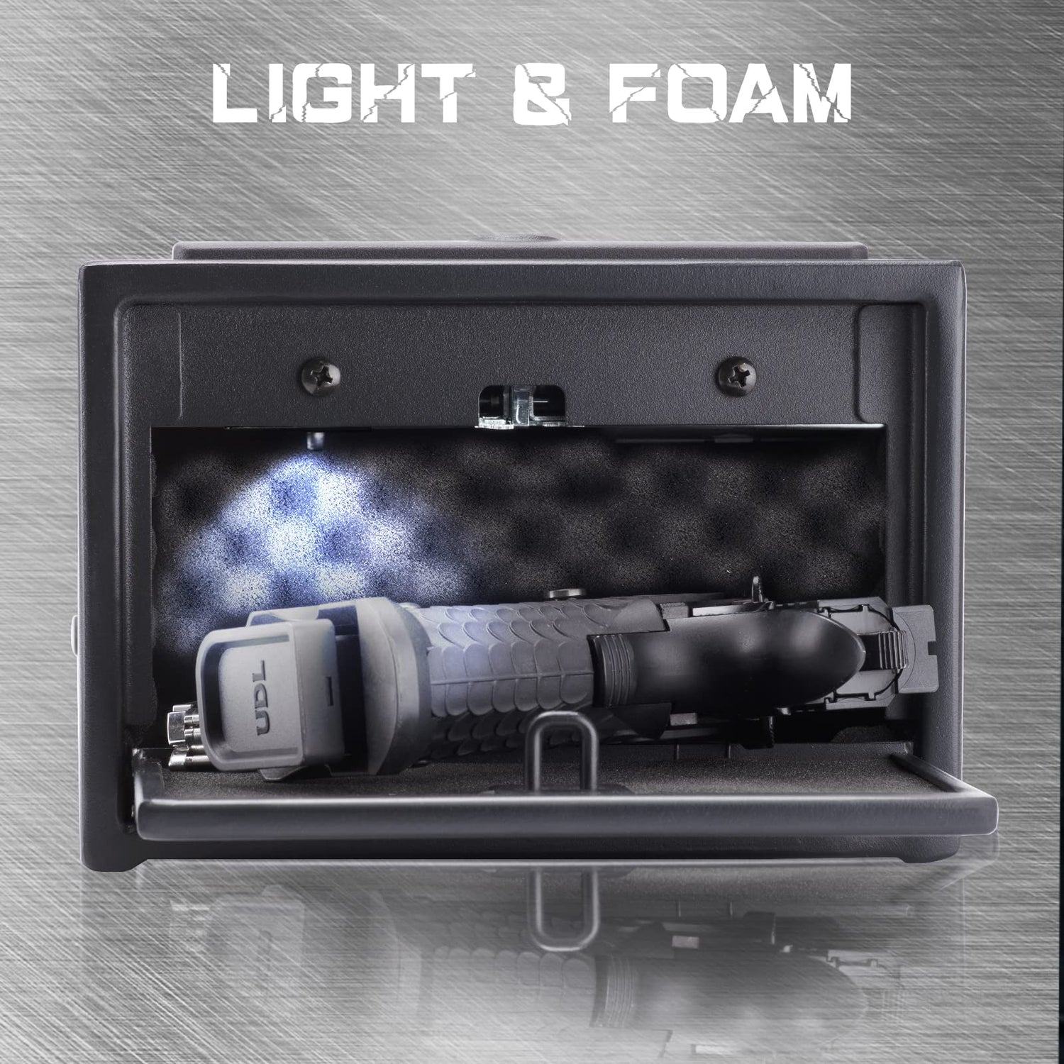 - Light Up And Foam: The gun safe for handgun has a built-in light, so this pistol safe can be operated in a dark environment; The interior sponge 270 degree protects the pistol from being scratched