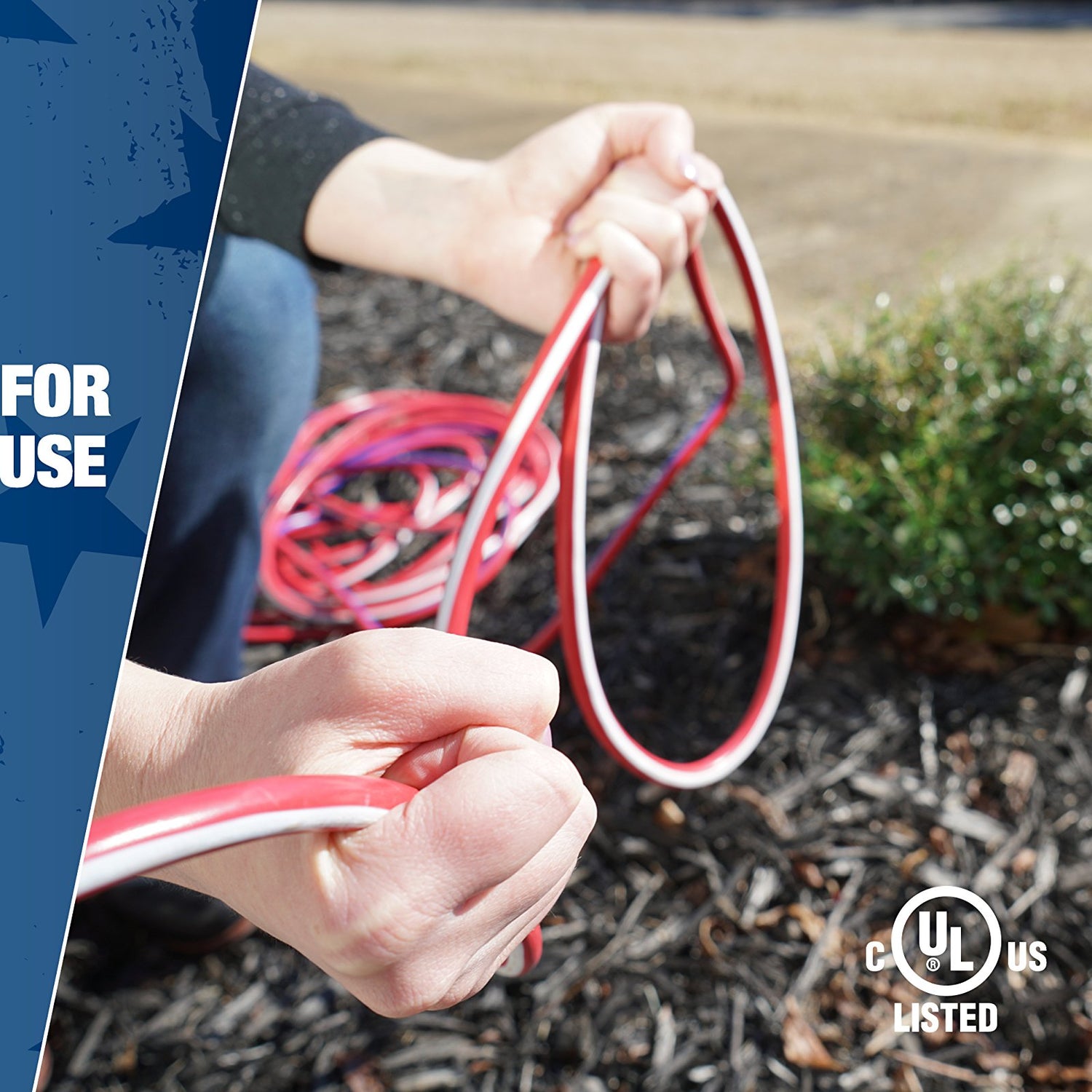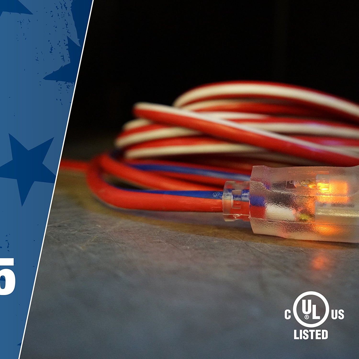 Details: Coleman Cable 02549-USA1 American Made Extension Cord; Contractor Grade with Lighted End; Red/White/Blue; 100-Feet. Rugged 100-Feet red; white; and blue outdoor American extension cord. Contractor grade 12-Gauge extension cord is dedicated to the American contractor. Made in the USA by an American company; a proud supporter of the wounded warrior project. Vinyl pro-power cord has molded water-resistant connectors with reinforced blades-suitable all weather use. Lighted female end lets you know power is ready; 100-Feet 15-amp cord is 12/3-the standard of the construction industry. UL listed. OSHA and NEC compliant. Lighted female end. Molded male and female ends are water resistant. Highly visible red cord with blue and white stripes. Blue Stenciled stripe says "Made in the usa by CCI; proud to be American". 15-amp rating at 125-Volt.
