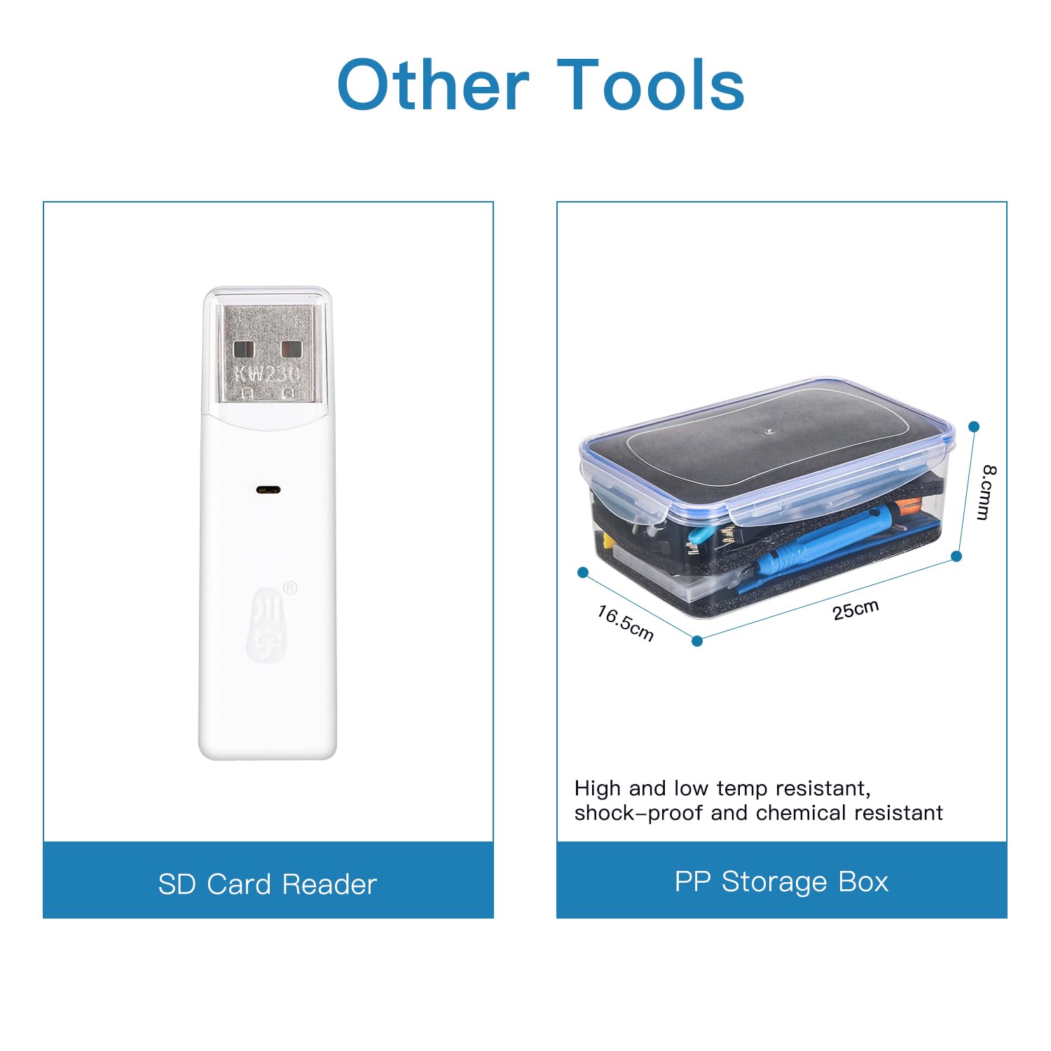 - 【Tools Storage Box & SD Card Reader】This Tool set also comes with a durable and translucent Tools Storage Box to store your all tools concerning to 3D Printer. Make your desktop tidier and you won’t have the trouble of losing tools. You can keep the SD card reader as spare parts in case your old one is broken coincidentally when you want to print.