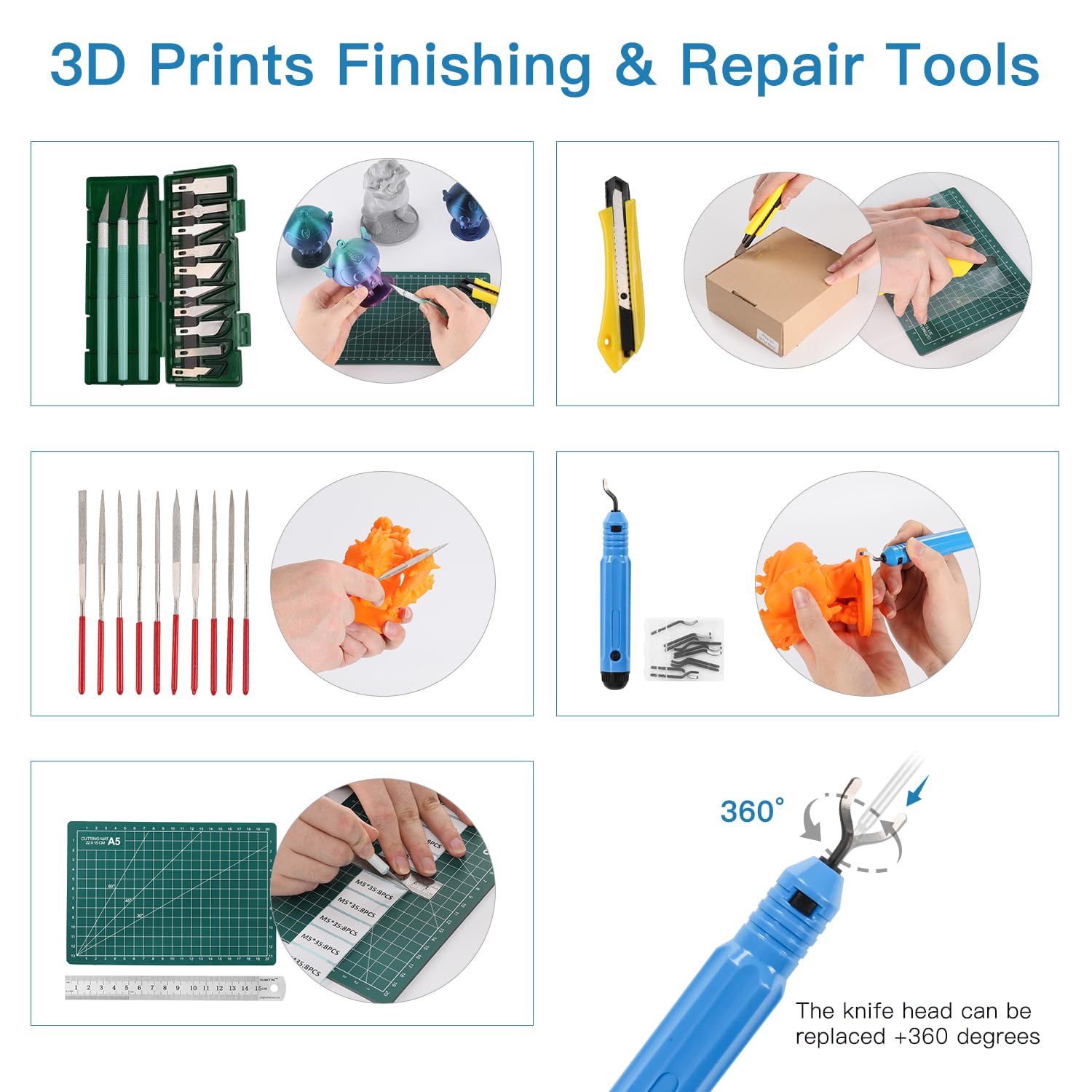 - 【Cutter & Removal Tool Kit】When the prints completed, sometimes you would find out that the prints are hard to remove from the platform surface. At this time the removal tool would help you to remove prints. Cutters and pliers can process prints details and remove excess material, burrs, and prints supports, allowing you to complete your job quickly and efficiently.
