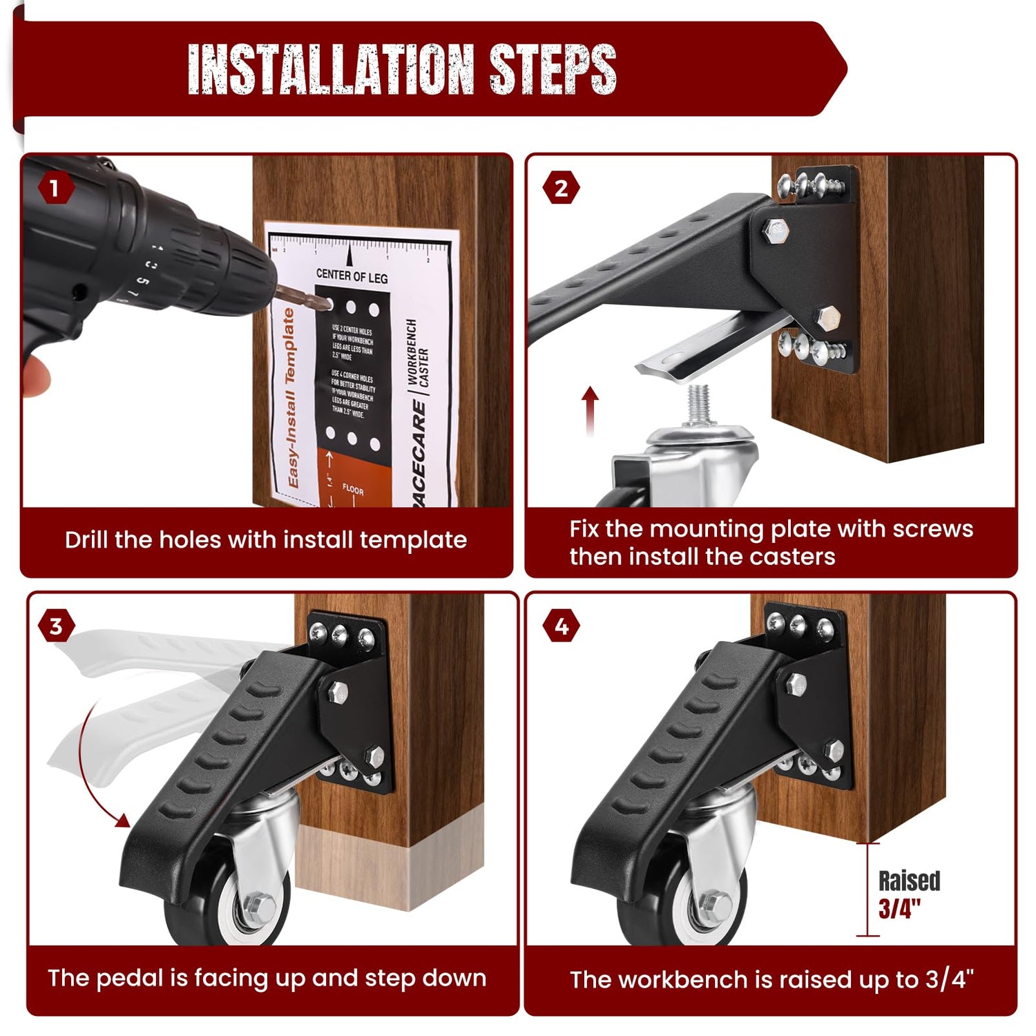 SPACECARE Workbench Casters Heavy Duty Retractable Casters Kit, Capacity 800Lbs Set of 4 Stepdown Casters Adjustable Polyurethane Durable Steel Construction