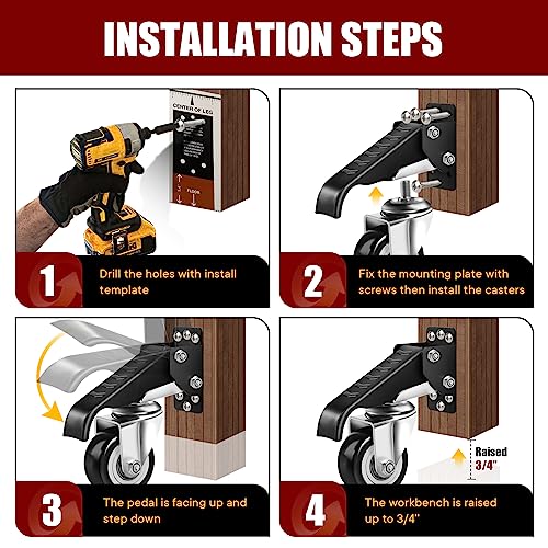 - 【Mounting Screws Included】- We offer 16 screws that is enough for retractable casters installation, but it depends on you whether to install 24 screws or not. Better to make holes in workbench legs with a driller(not included) before installing workbench casters.