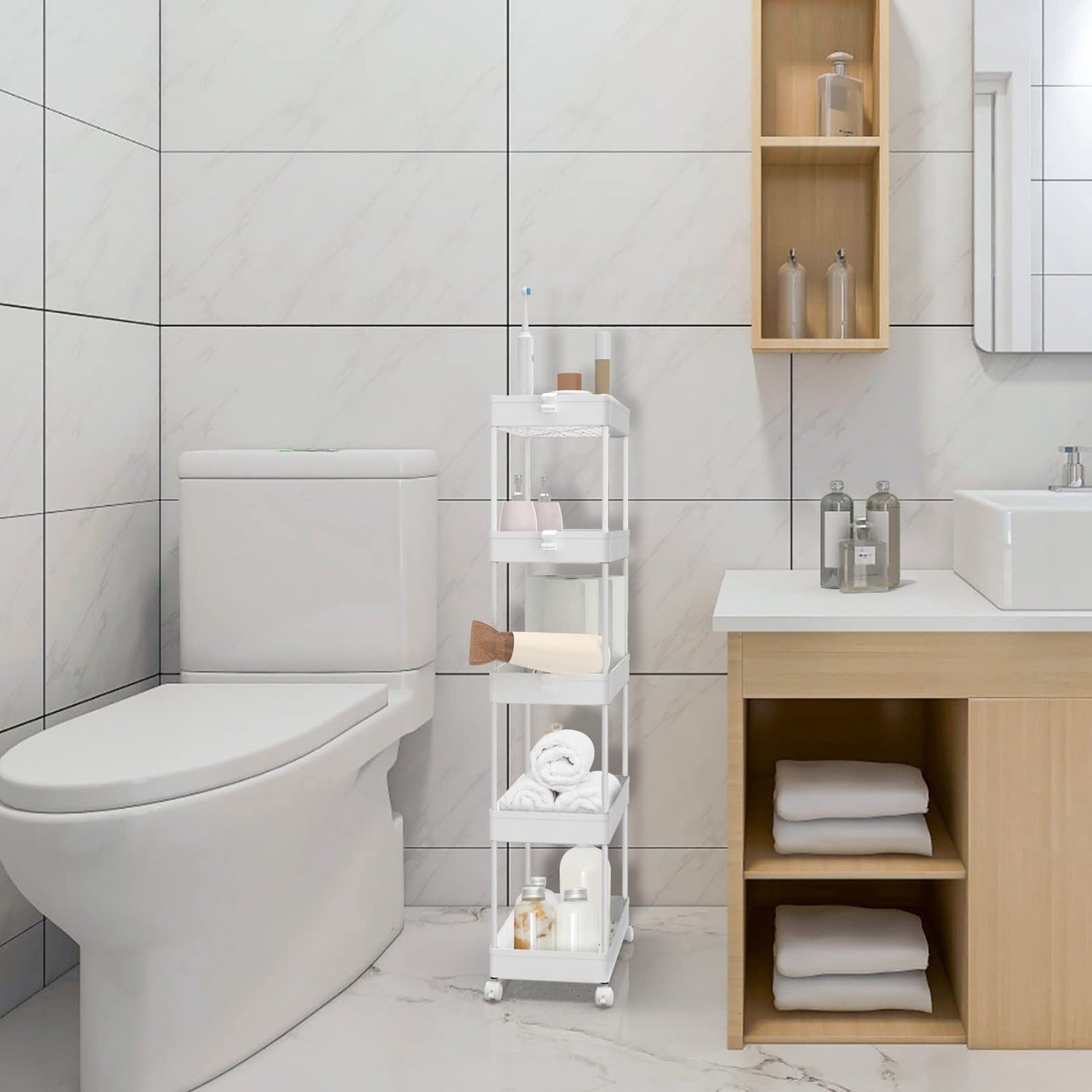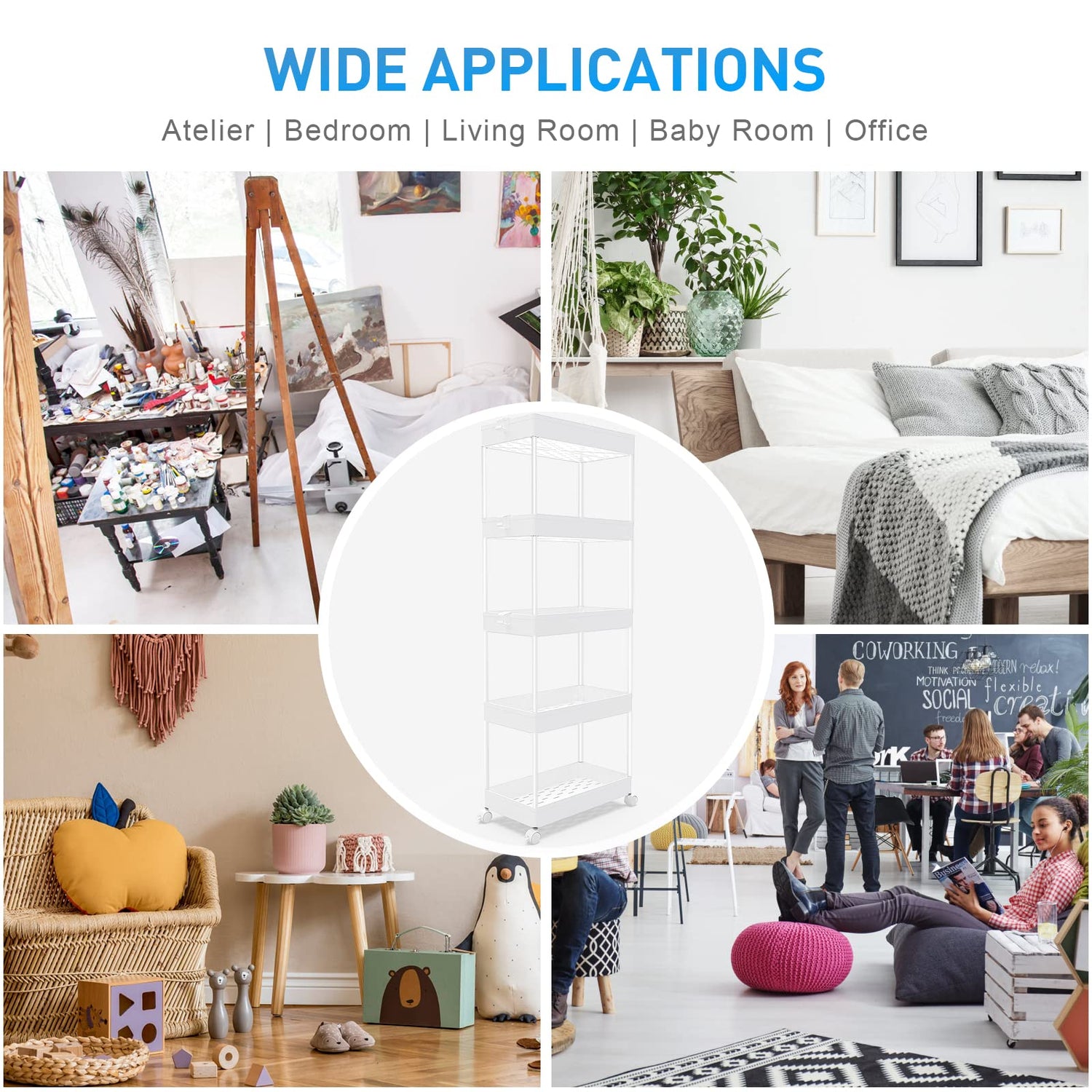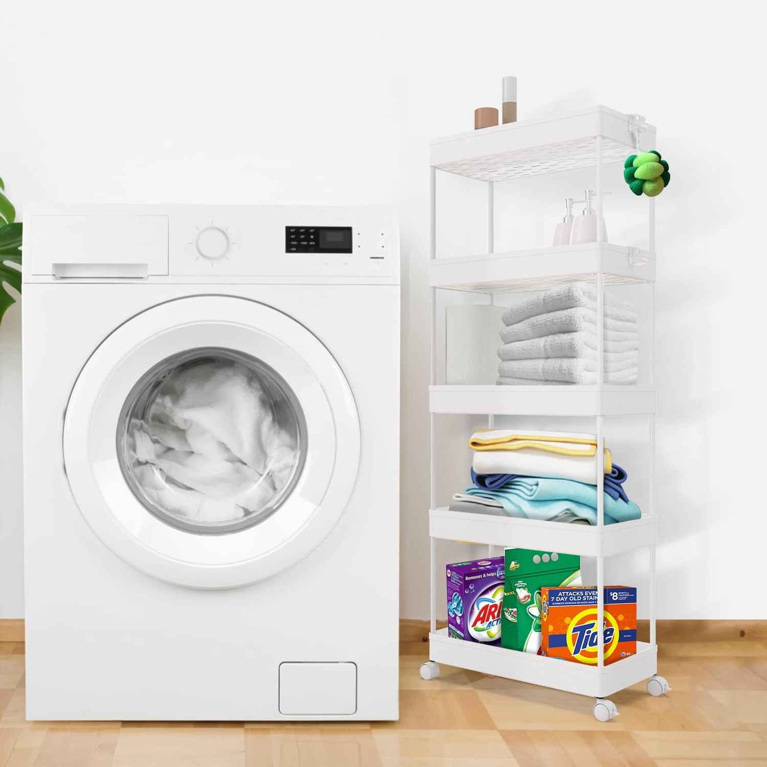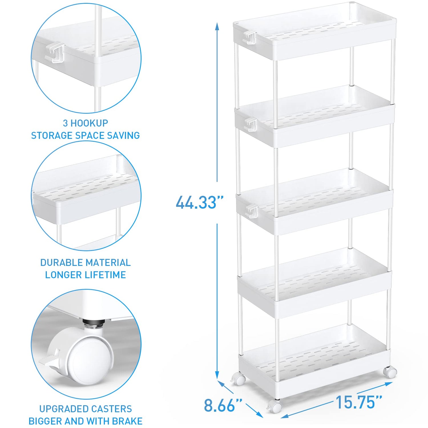 - 【Flexible Storage Cart】- The 5-tier Rolling storage utility cart is 8.66 in design which can be used in tight spaces in your home for storage. Suitable for closets, kitchens, bathrooms, garages, laundry rooms, offices.