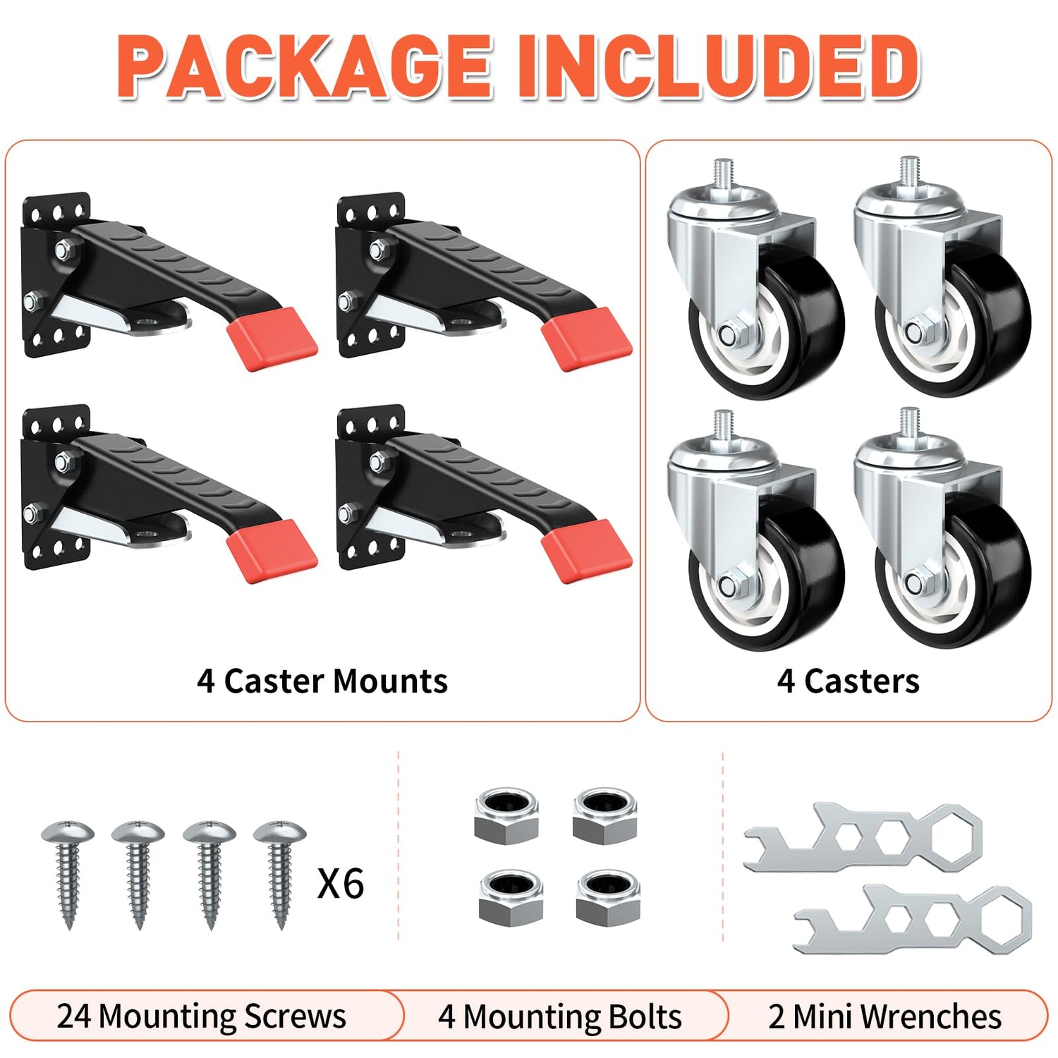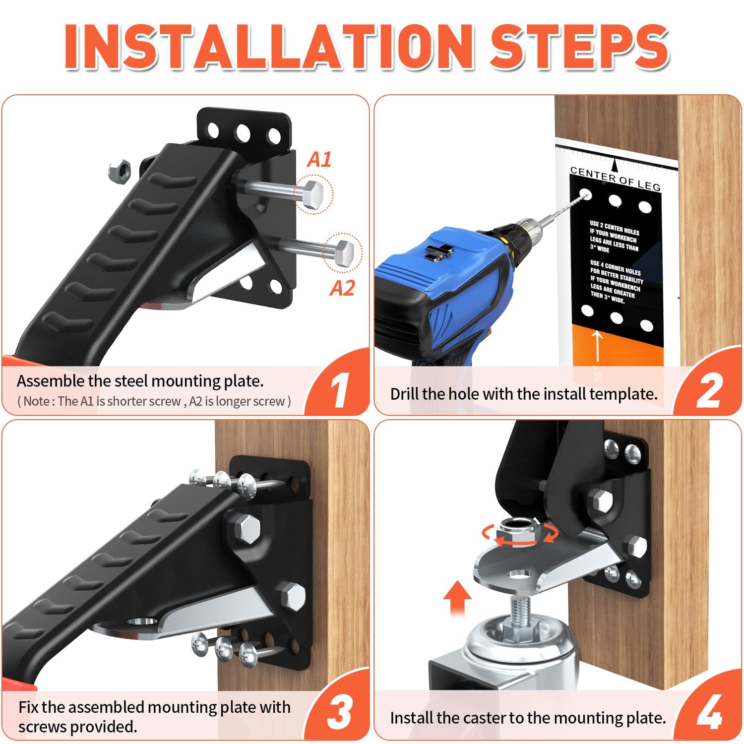 - Package Included - The workbench caster set include 4 workbench caster assemblies, all the necessary mounting hardware and instructions.