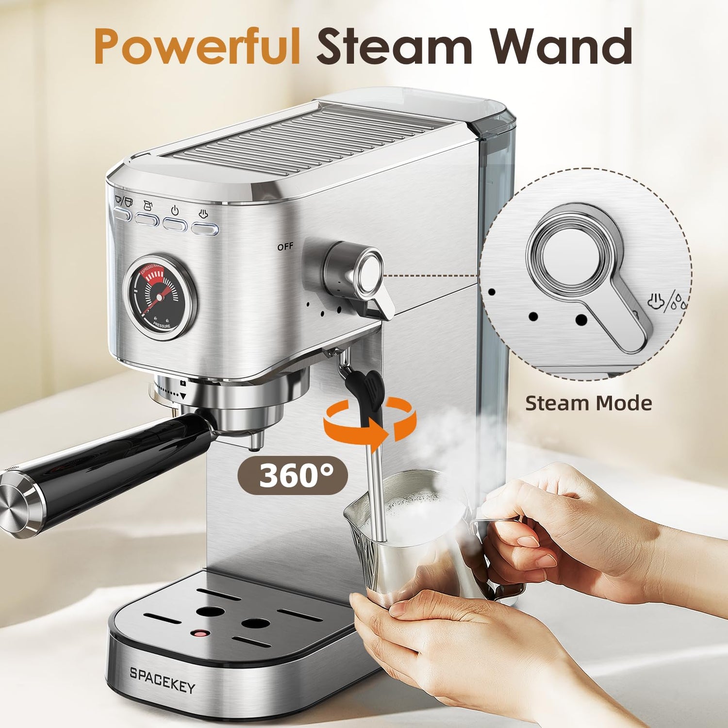 Spacekey Espresso Machine 20 Bar, Professional 1350W Espresso Maker with Milk Frother, Compact Stainless Steel Cappuccino & Latte & Americano Maker with 39oz Removable Water Tank, Silver