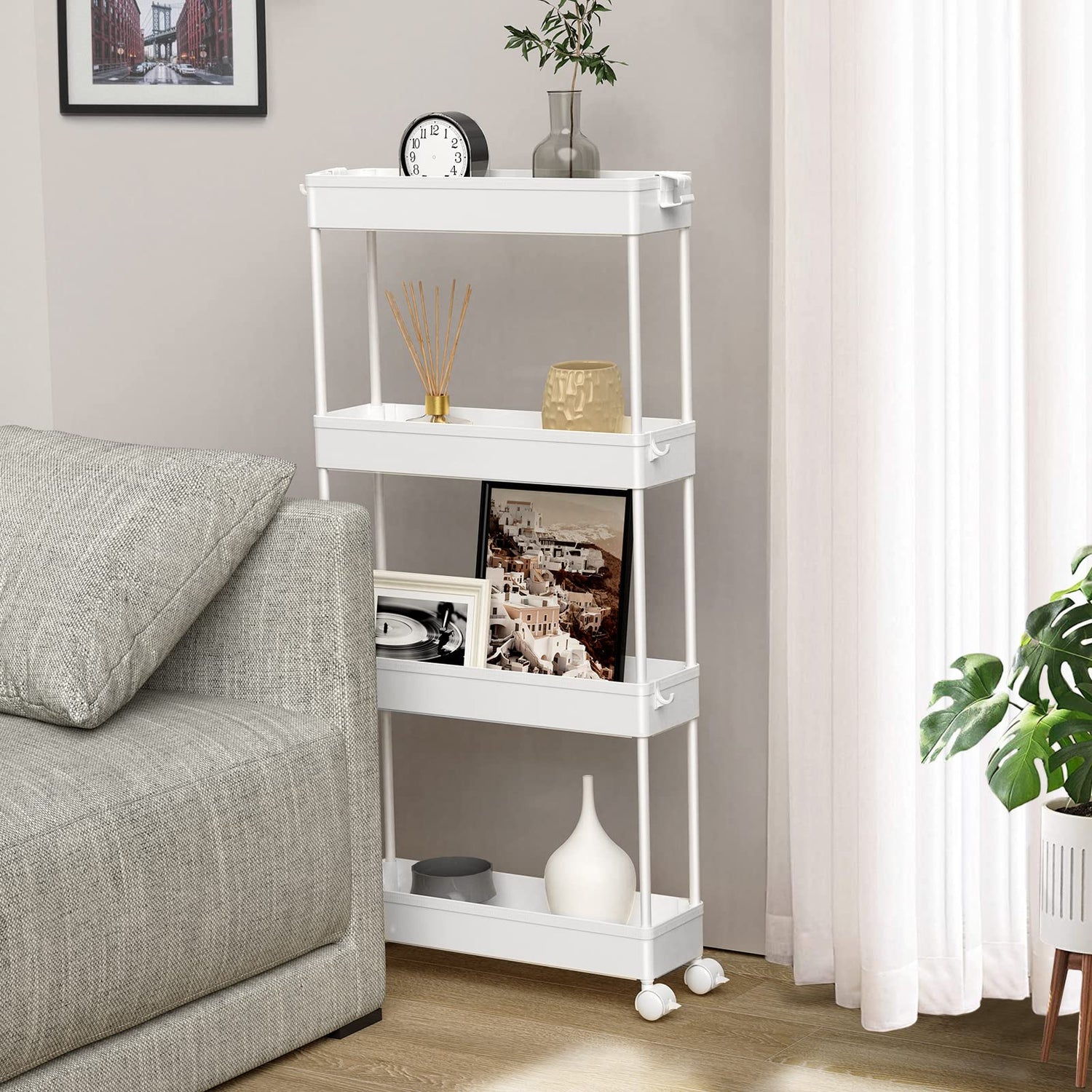 SPACELEAD Slim Storage Cart 4 Tier,Bathroom Organizer Rolling Utility, Mobile Shelving Unit Slide Out for Office, Kitchen, Laundry Room & Narrow Places,White