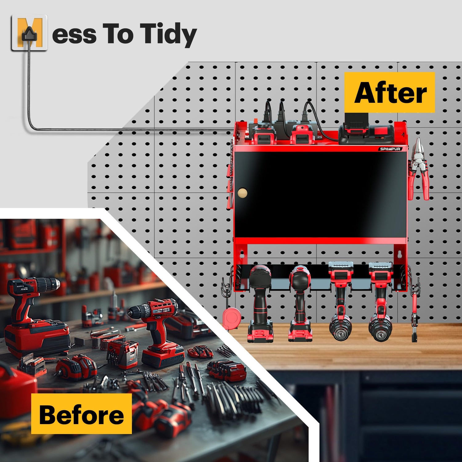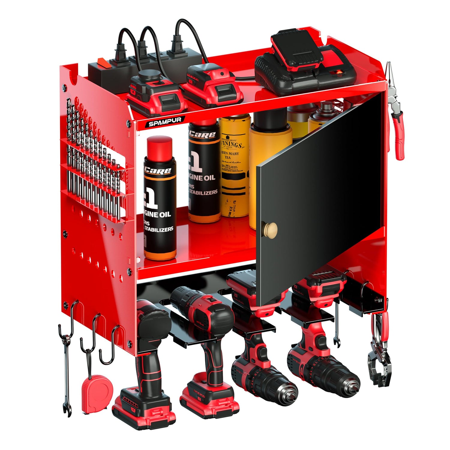 - Expert in Power Tool Storage: power tool box with charging station, come with 4 outlets and a tool cabinet with a door, you can charge everything right in the rack and avoid searching for sockets,valuable tools can be stored in the cabinet for better protection