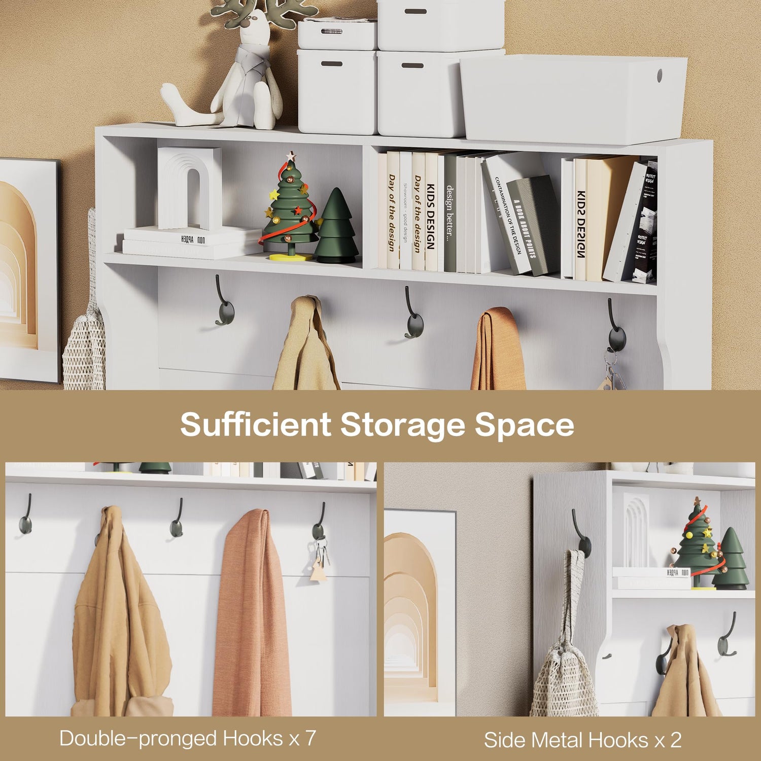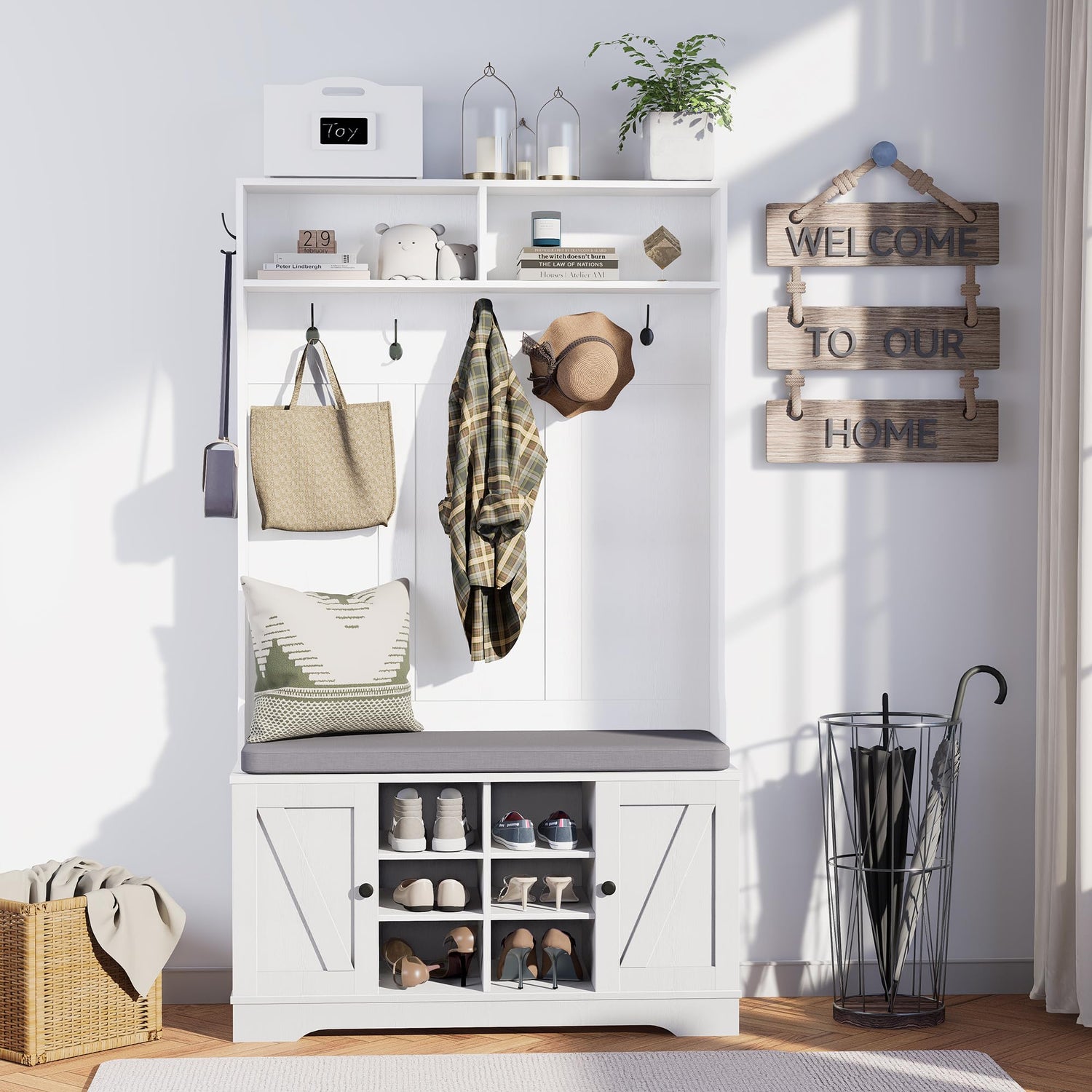 - 4-in-1 Design: This hall tree combines a coat rack, bench, shoe storage, and display area. The hooks keep coats and bags organized, while the bench is ideal for changing shoes. The built-in storage compartment conceals small-sized shoes and other items, ensuring a tidy entryway. The top shelf provides a perfect spot for decor and plants, making this hall tree both functional and stylish