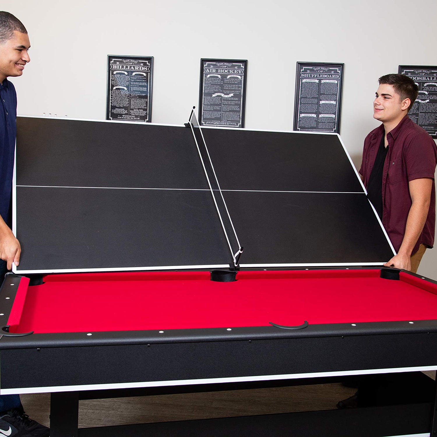 - DOUBLE THE FUN – Save space with this gorgeous, mid-size pool and table tennis combination table. Its lightweight tennis table top easily installs over the table frame, keeping the fun rolling at a crisp, competitive pace.