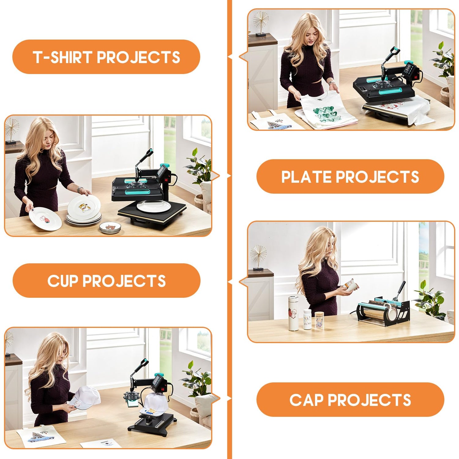 - Versatile Use: 5 in 1 heat press comes with multiple attachments, suitable for T-shirts, mugs (upgraded 30oz press), hats, plates, fulfilling various DIY needs for small studios and personal use