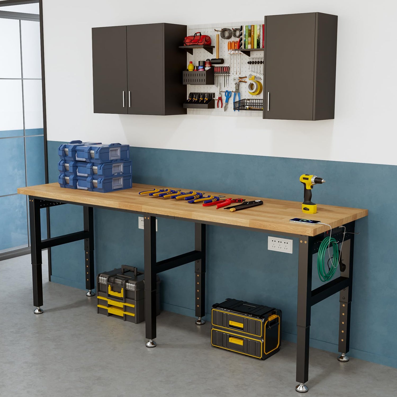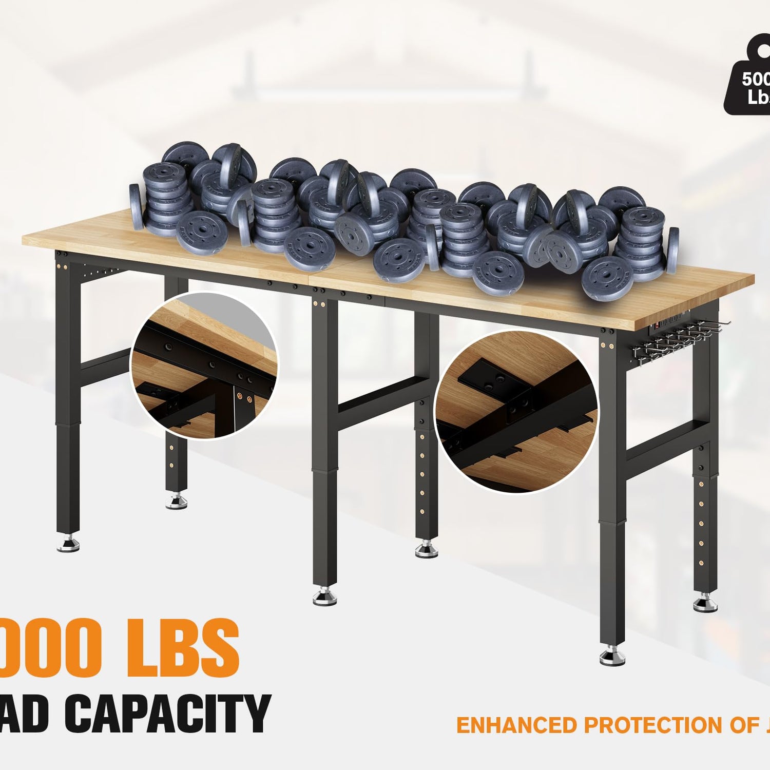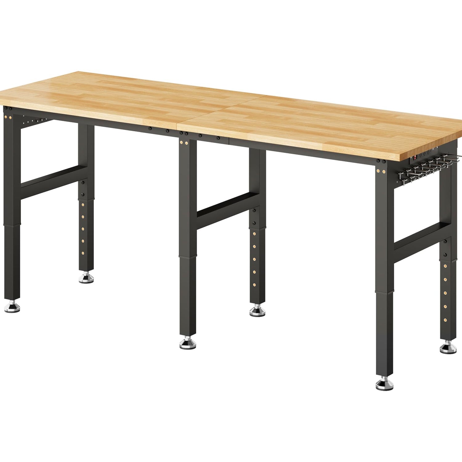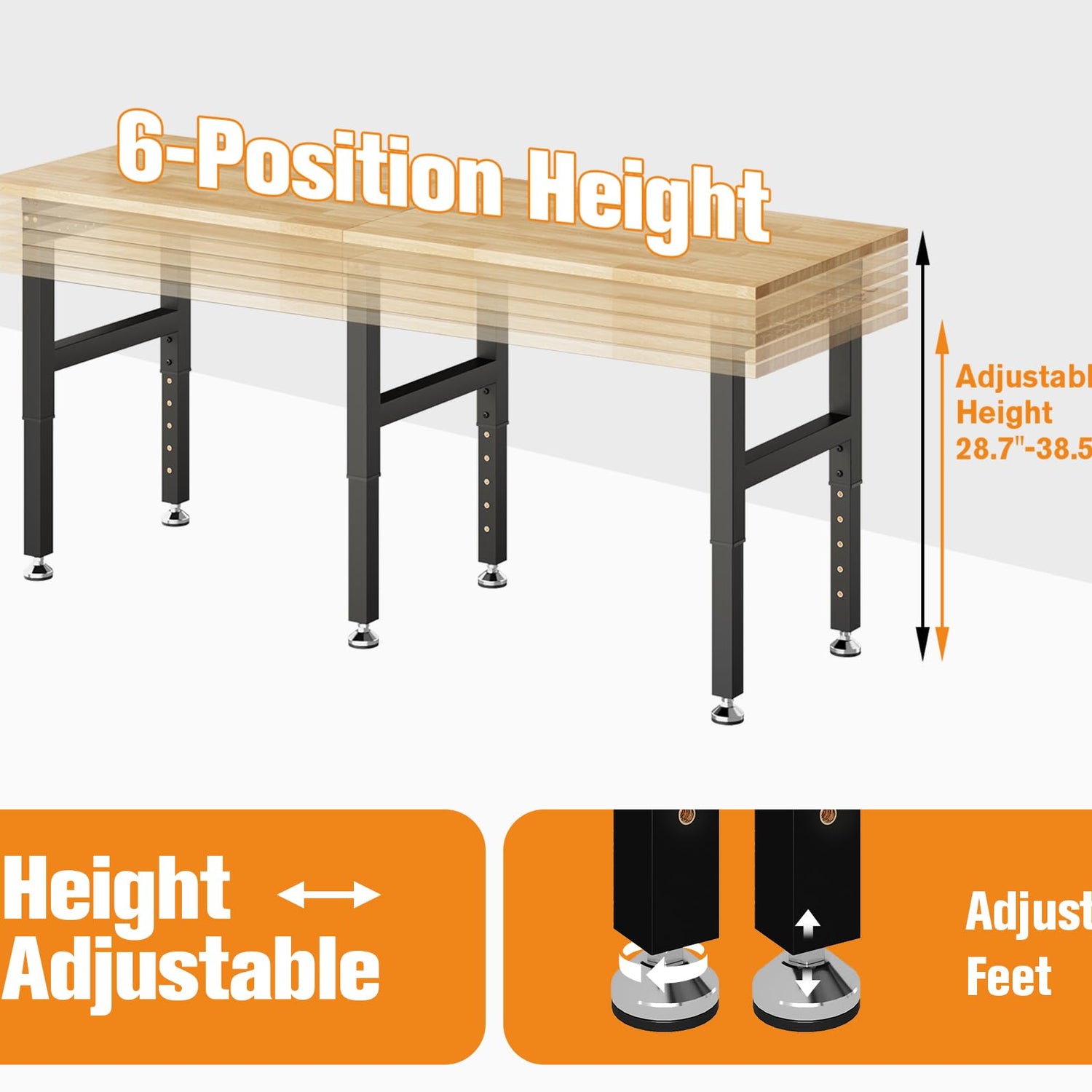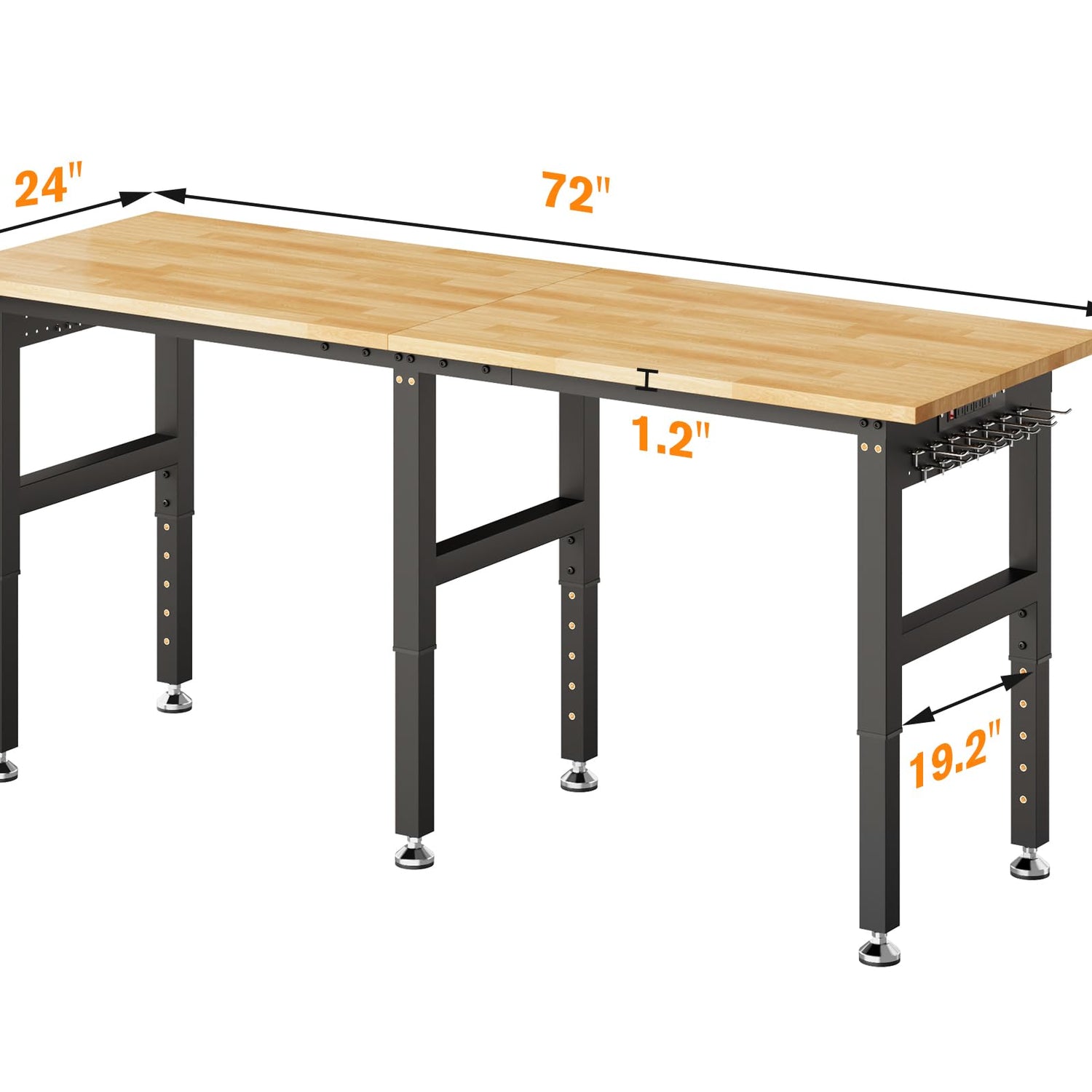 SPECRAFT 72“ Adjustable Heavy Duty Workbench with 4 AC Outlet and 2 USB Ports Power Outlets, 5000 Lbs Capacity, Rubber Wood Top for Garage, Workshop, Office