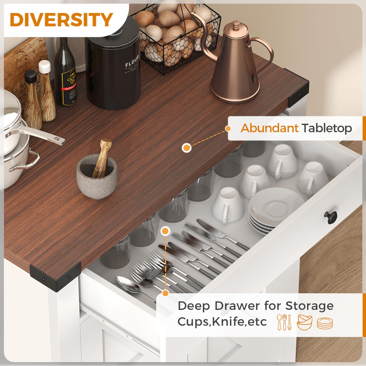 - 【Farmhouse Style】This farmhouse coffee bars cabinet feature a farmhouse look with natural wood grain and unique barn doors. Meanwhile, the drawers and doors are equipped with cushioning for safety and sound reduction, a perfect blend of rustic and vintage styles that can easily match most decorative themes.