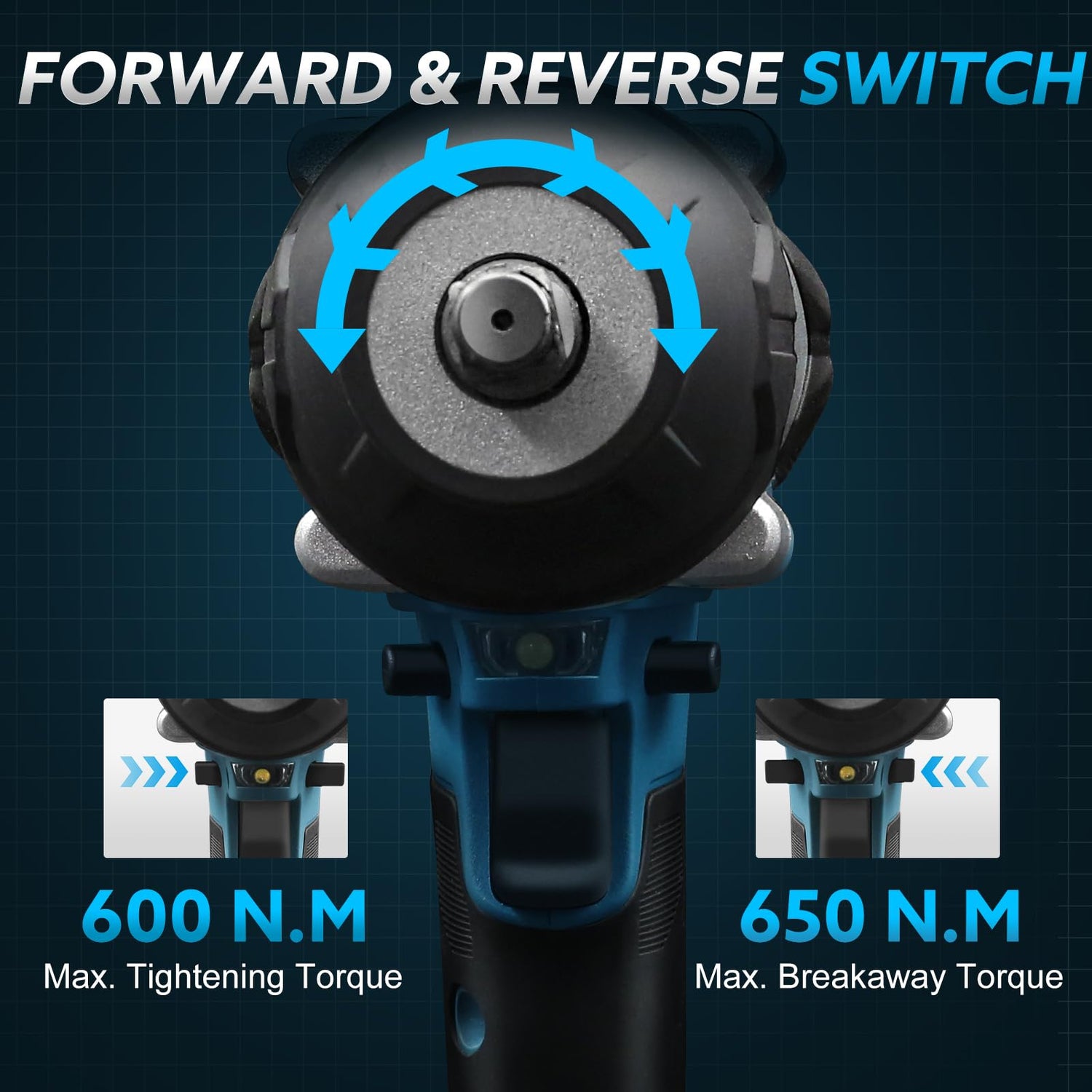- 【4 Adjustable Speed Modes】- The speed of the 1/2 impact wrench is divided into 4 gears (0-1700/2000/2200/2700 RPM ) to meet different work demands. The first gear is the highest gear and then gradually decreases. You can change the direction of rotation by adjusting the forward & reverse buttons. When rotating in reverse, pressing the switch button can trigger the brake stop function, without worrying about the bolts flying off to nowhere to be caught.