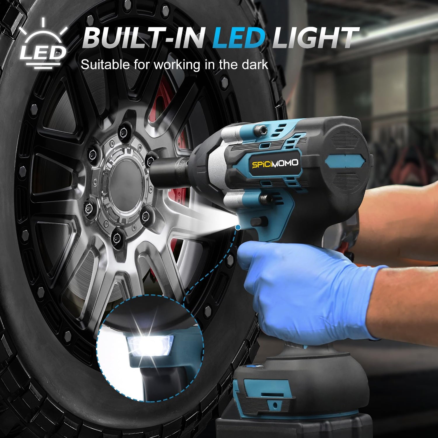 - 【600N.m High Torque & Brushless Motor】- SPICIMOMO 1/2 cordless impact wrench exhibits excellent performance with a maximum torque of 443 ft-lbs (600N.m) and maximum speed of 2700 RPM, which can help you quickly tighten or remove screws in seconds. The brushless motor do not generate sparks during operation and have a longer lifespan than brush motors, greatly improving your efficiency and saving energy.