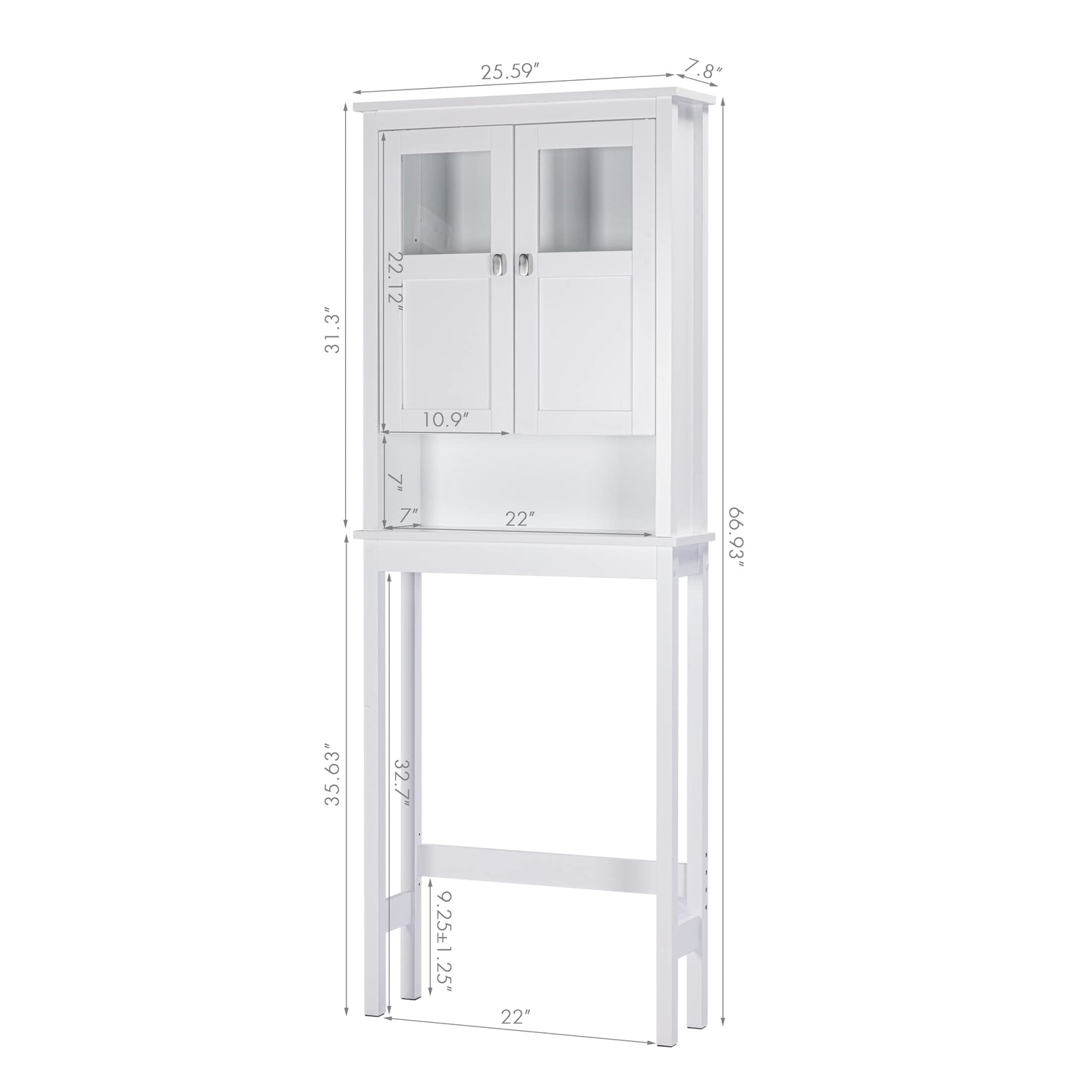 With dimensions of 25.59 inches in width, 7.8 inches in depth, and 66.93 inches in height, this over-the-toilet cabinet is designed to be a practical space-saver, fitting seamlessly into smaller bathrooms without compromising on style.