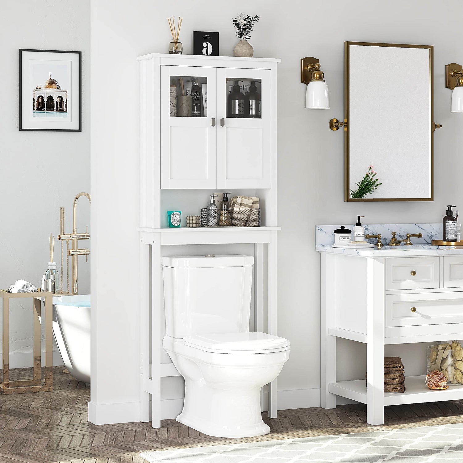 Spirich White Over Toilet Bathroom Storage Cabinet with Glass Doors and Adjustable Shelves