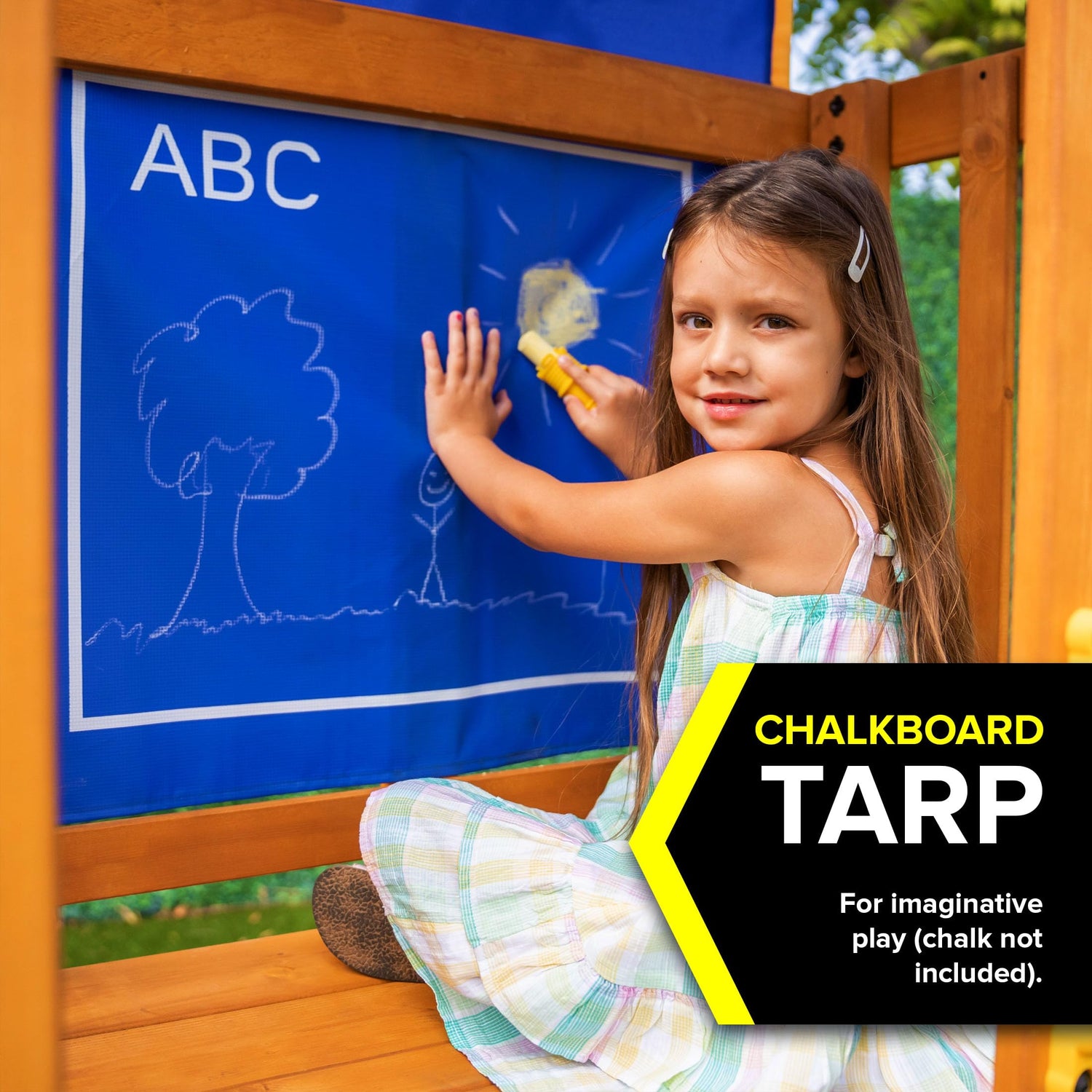 Details: The Sportspower Augusta Wooden Swing Set brings all the fun straight to your backyard! The swing set is constructed of sturdy Scandinavian Fir, which is 18% heavier than competitors wood from China. This swing set has a double A frame, that our competition does not, providing extra stability and safety. The set includes 2 sling swings that are height adjustable, a rock climber that leads the playfort deck with canopy, a sandbox and a 6ft double walled, blow-molded slide for extra durability. Competition uses single wall slide. With the variety of playing elements, your kids will exercise and work on their motor skills, all while having fun. All Sportspower products meet or exceed all ASTM safety standards, so kids and parents can both enjoy the Augusta Wood Swing Set with a peace of mind. Limited LifetimeWarranty on the slide. Bonus anchor kit included.