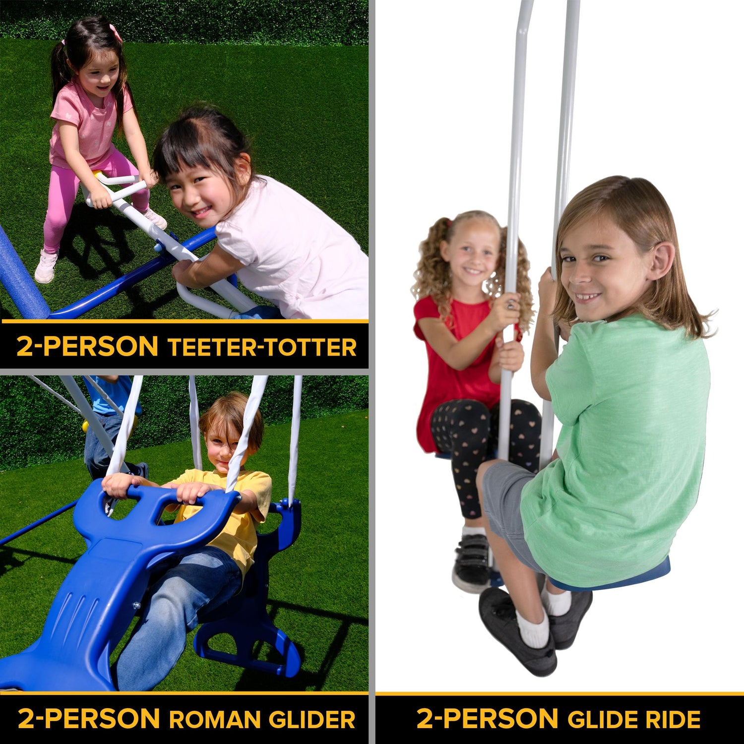 Sportspower Super 9 Metal Swing Set: Teeter Totter, 2 Kid Glide Ride Swing/Roman Glider Swing, Standing Swing + Trapeze Bar, Blow Molded Swing + 5' Wavy Slide Bonus 4pc Anchor Kit*, Blue/Yellow