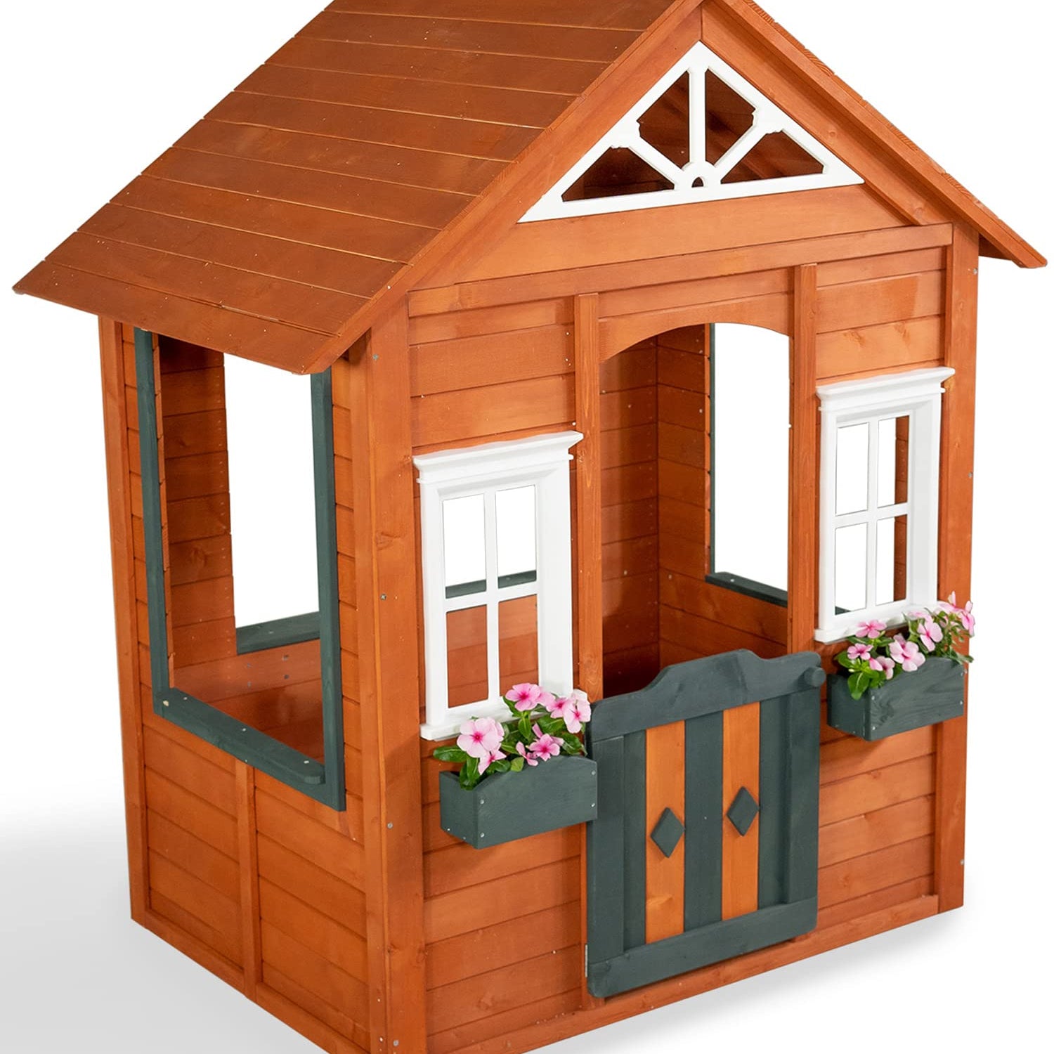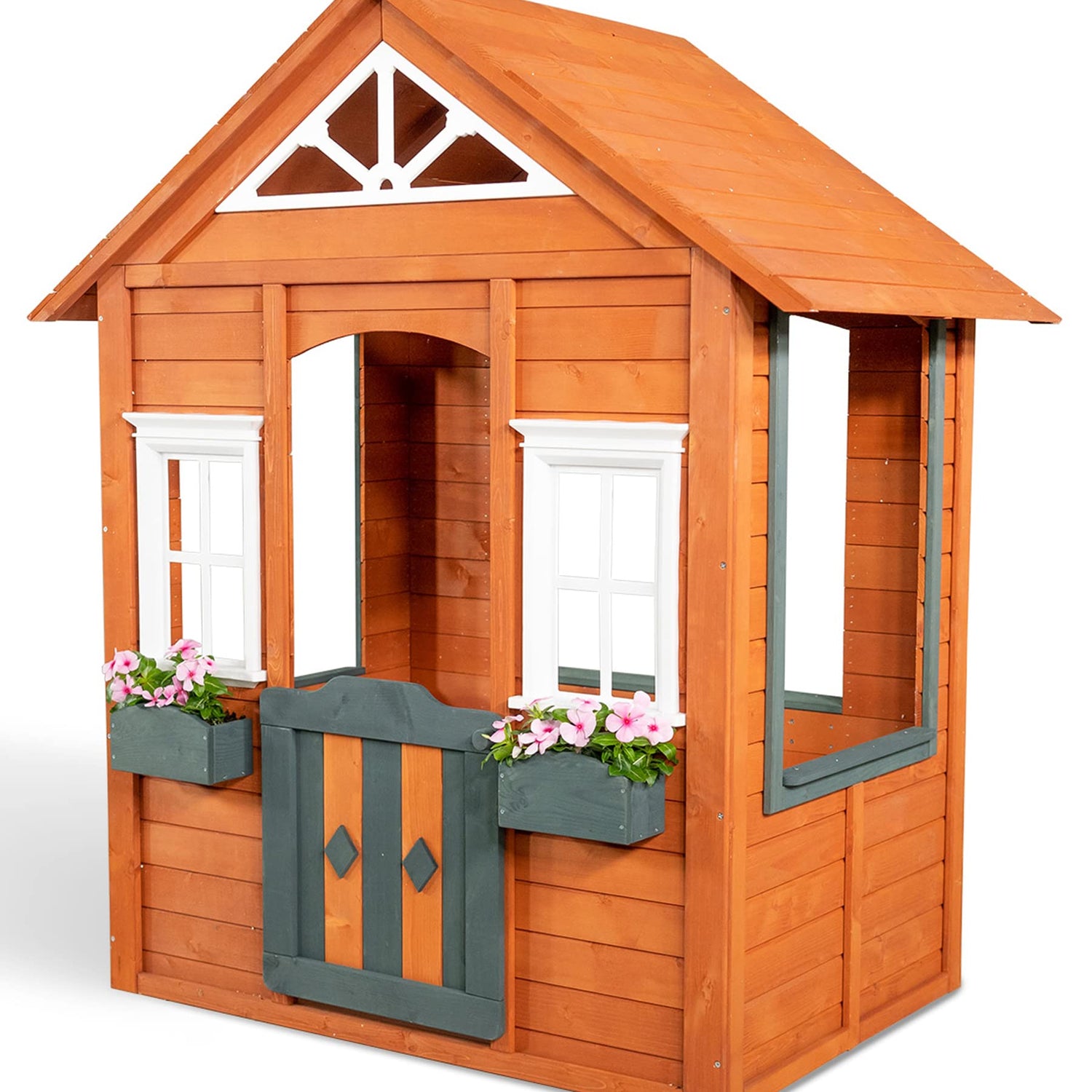 Sportspower Woodbridge Wooden Outdoor Backyard Playhouse with Flower Boxes, Red