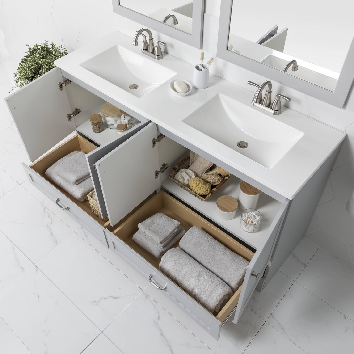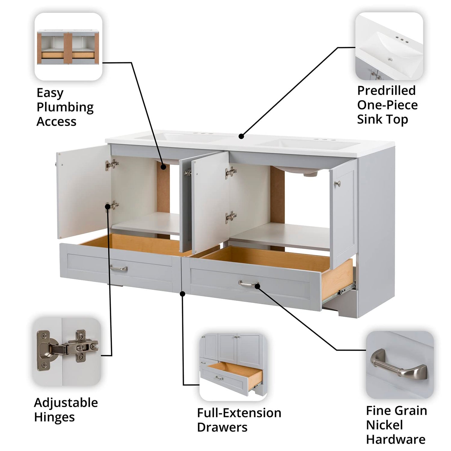 Details: Spring Mill Cabinets 60.5" freestanding Emlyn double-sink bathroom vanity features a Shaker-style profile with its full overlay 5-piece door- and drawer-fronts. This spacious bathroom vanity with sink top will keep your bathroom essentials organized with a 2-door cabinet and a full-extension drawer below each sink. Finished in a light cool-toned pearl gray, this bathroom cabinet is complemented by fine grain nickel door and drawer pulls and a white cultured marble dual-sink vanity top with 2 integrated rectangular sinks for a seamless and stylish look. The sink top includes predrilled holes for two 4" centerset faucets, allowing you to choose the faucets that best fit your style. Designed for quick installation around your existing plumbing, this pre-assembled bathroom vanity with sink features an unattached sink top and an open back.