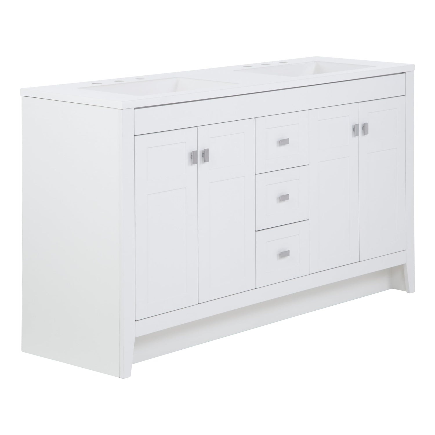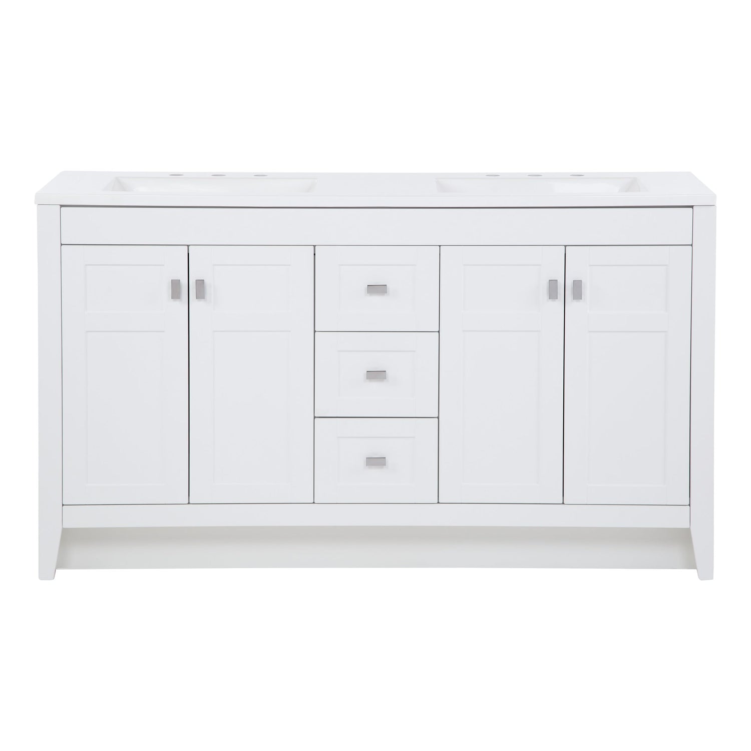 Details: Spring Mill Cabinets Lonsdale 62.5" double-sink bathroom vanity features a contemporary design with its recessed panel doors and drawers. This spacious white bathroom vanity with sink top will keep your bathroom essentials organized with a soft-close 2-door cabinet below each sink and 3 full-extension drawers that line the center. Constructed of engineered wood with a soft white laminate finish, this double bathroom cabinet is complemented by polished chrome door and drawer pulls and a 1-piece white cultured marble vanity top with 2 integrated rectangular sinks for a seamless and stylish look. The double-sink vanity top is predrilled for two 8-inch widespread faucets, allowing you to choose faucets that complement your style. Designed for quick installation around your existing plumbing, this pre-assembled double bathroom vanity with sink features an unattached sink top, adjustable drawer faces, 6-way adjustable hinges, and an open back design.