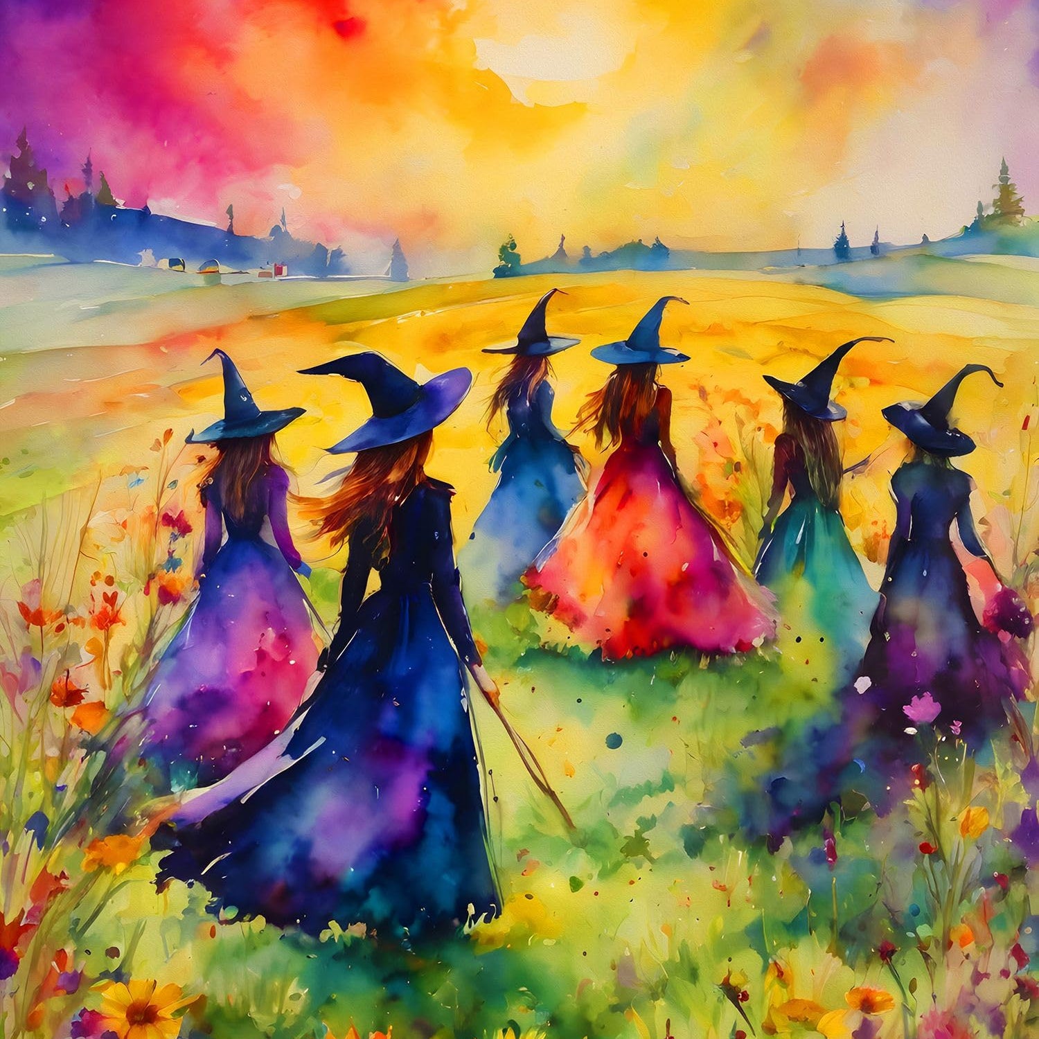 Springbok's Witches Gathering 500 Piece Puzzle for Adults is a Watercolor Image of Witches Gathering in a Blossoming Field