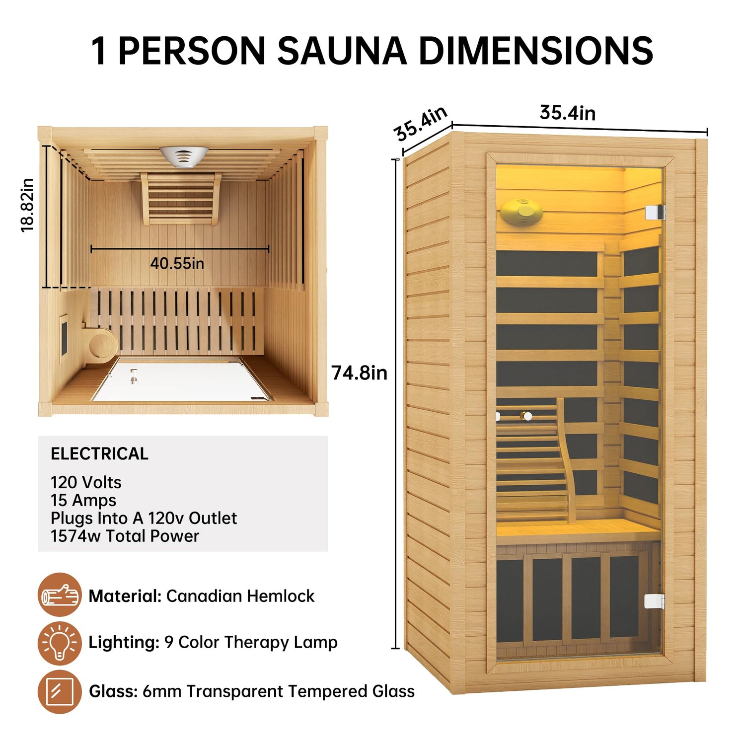 springspa Far Infrared Sauna 1 Person Indoor Sauna Spa Room, Canadian Hemlock Wooden Infrared Saunas for Home with Low Emf Lighting, Bluetooth Speakers, LCD Control Panel, 9 Chromotherapy