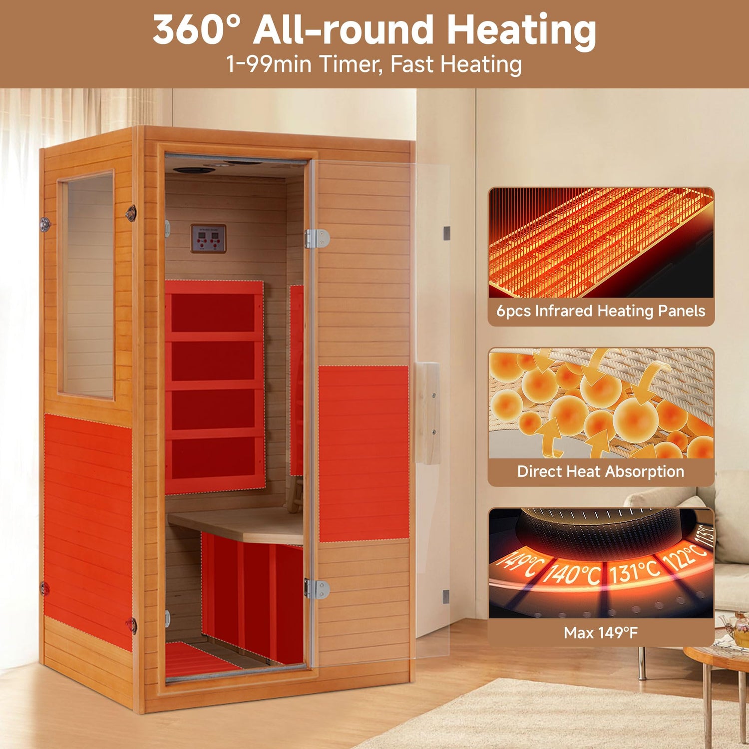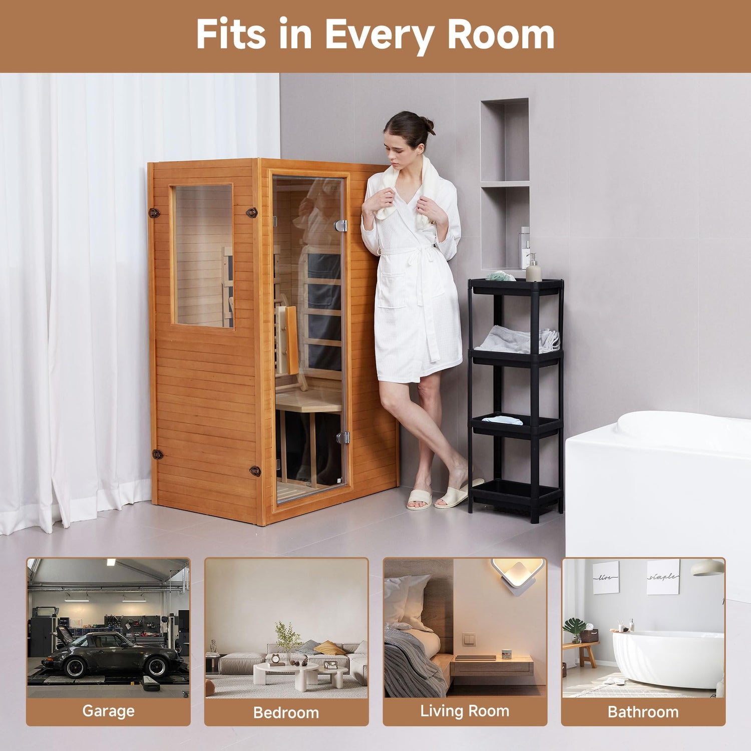 - 1 Person Far Infrared Sauna: The home sauna measures 33*27.3*59 inches (L*W*H), which small size, low space requirements, provides a luxurious personal saunas experience for one person. Ideal for small spaces like bedrooms, home gyms, or even garage