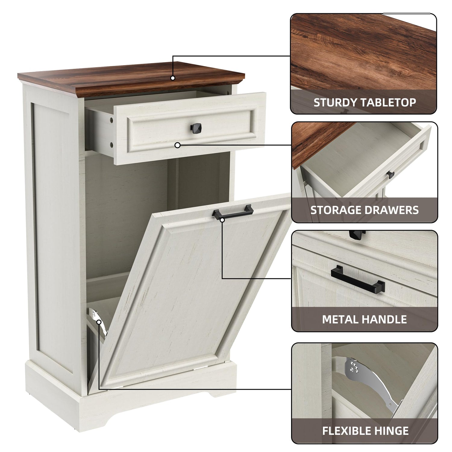 - Multifunctional Design: The trash cabinet is not only a practical kitchen trash can but it can also be used as the laundry basket or recycling bin, as well as a pet food bin. The drawers provide the convenient storage space for small sundries.