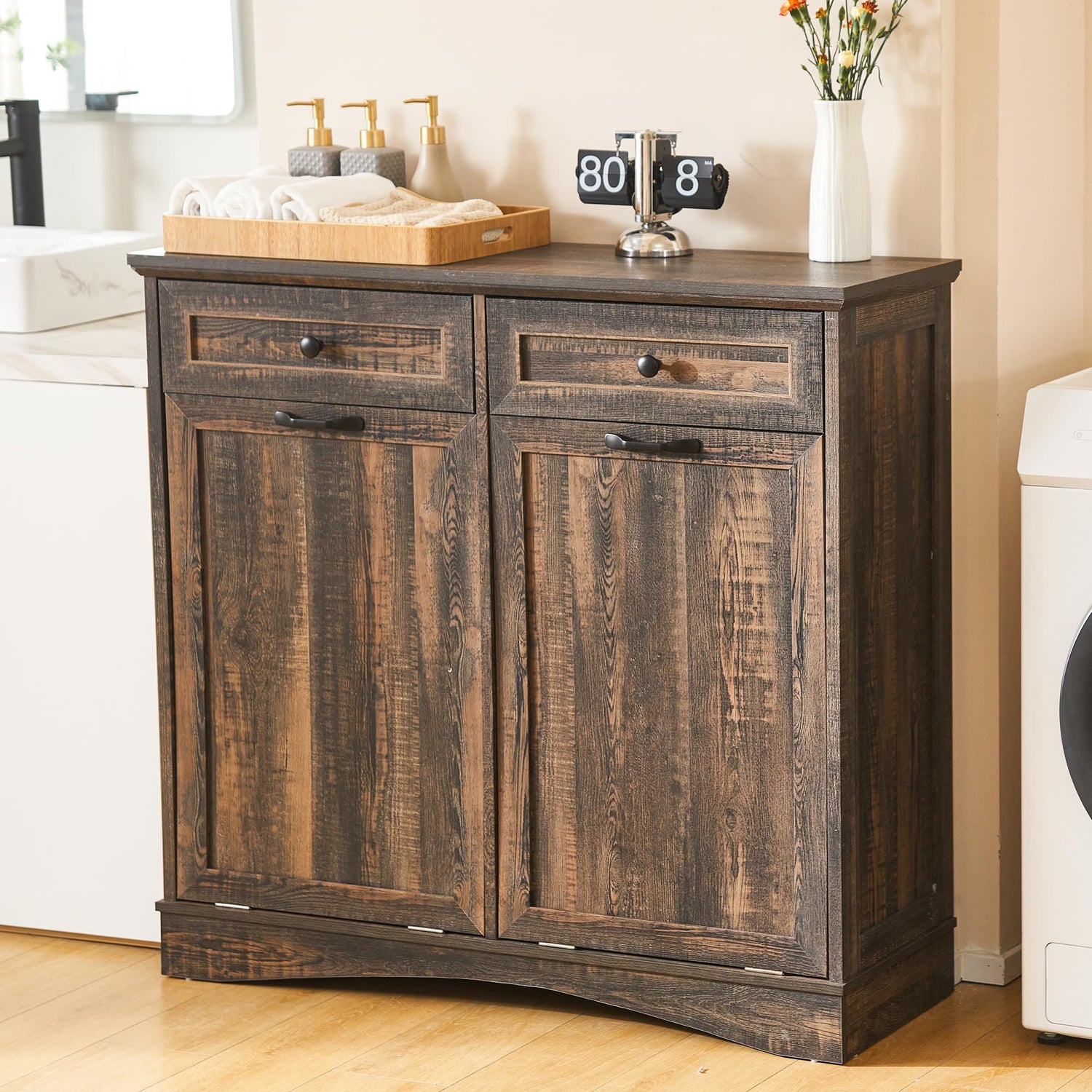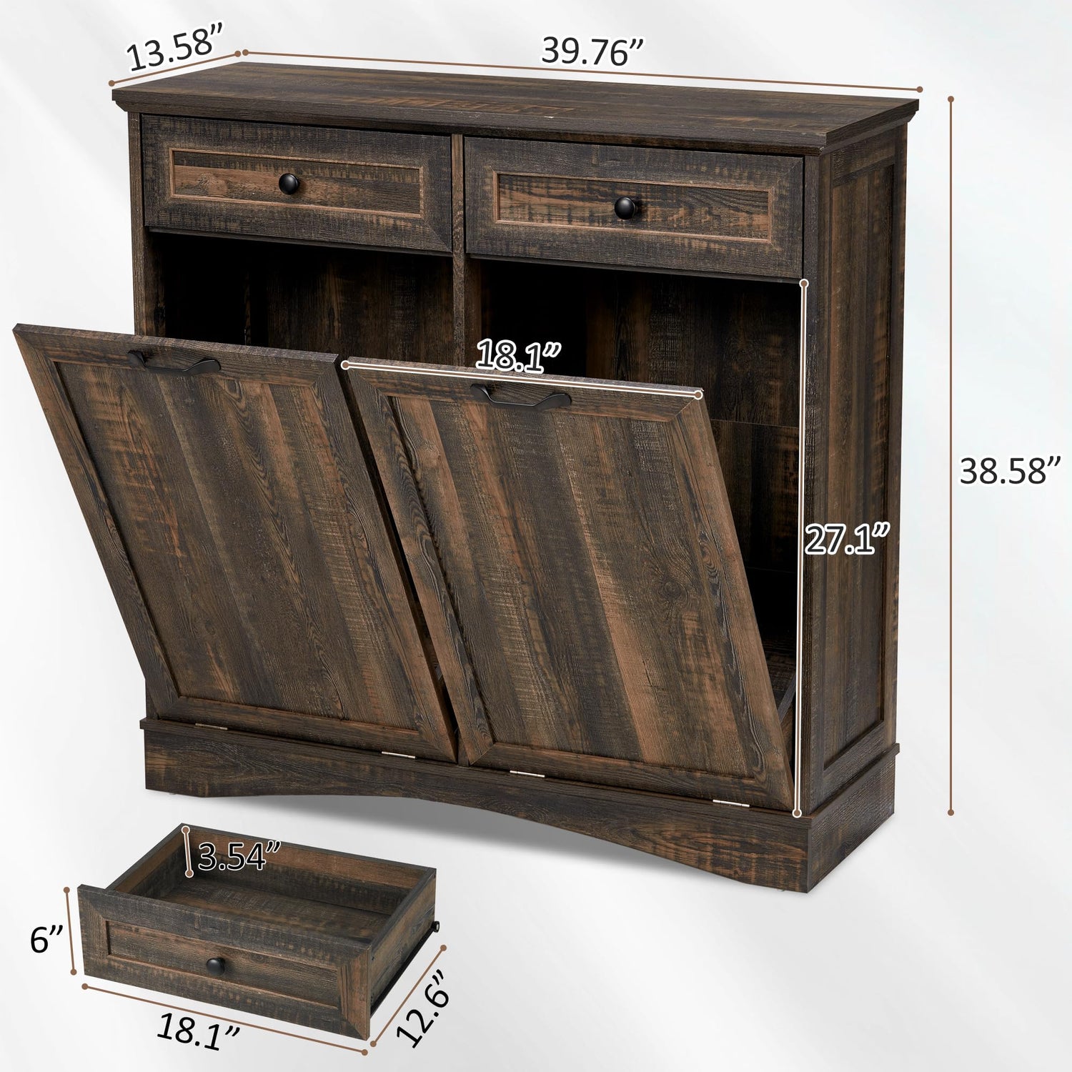 - 【Durable and Stable】Spurgehom Trash Can Cabinet is designed and constructed with rust-resistant hinges/knobs, quality drawer slides, and laundry baskets. Note: Fits plastic trash cans 13 gallons or less.
