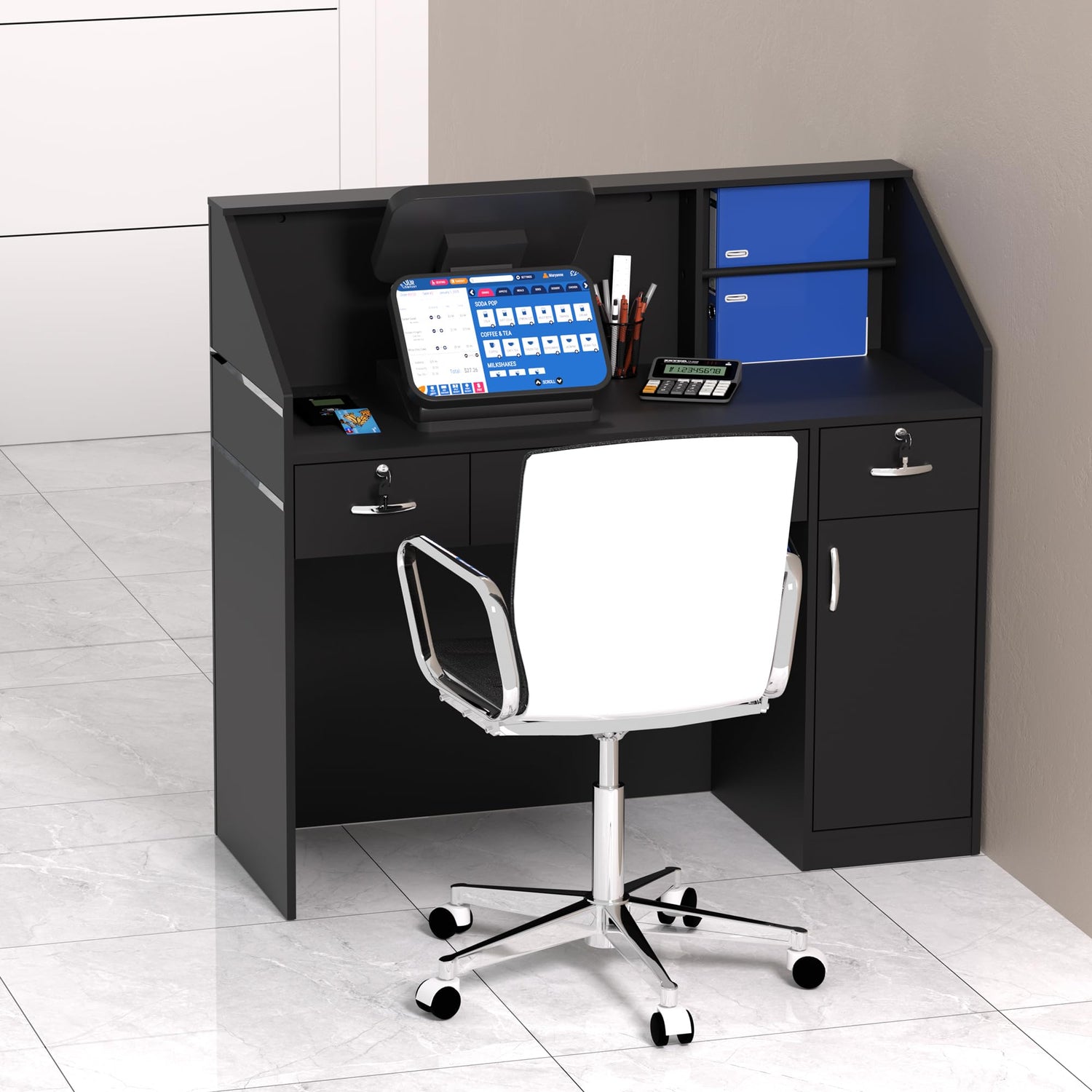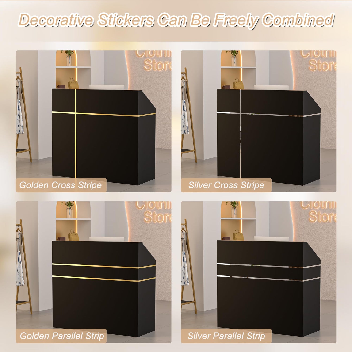 Spurgehom Reception Desk with Counter, Modern Front Table Equipped Lockers & Storage Shelves, 48-inch Checkout Counter with DIY Stripe for Lobbies, Salons, Retail, Home Offices, Reception Room