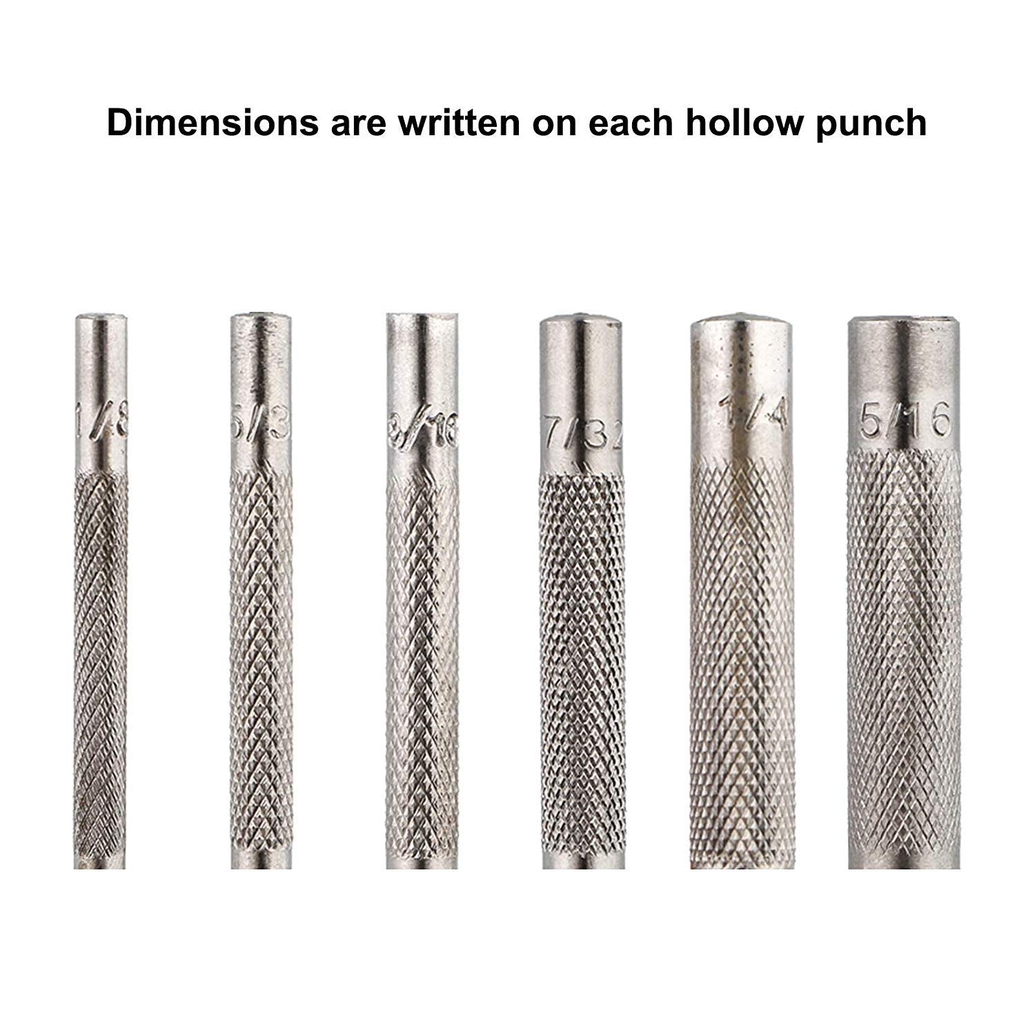 - 6 individual hole punch set sizes (inches): 1/8‘’, 5/32’’, 3/16’’, 7/32’’, 1/4’’ and 5/16’’, a leather punch set capable of punching several hole sizes