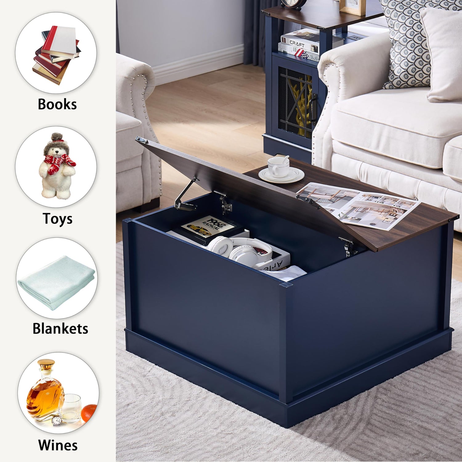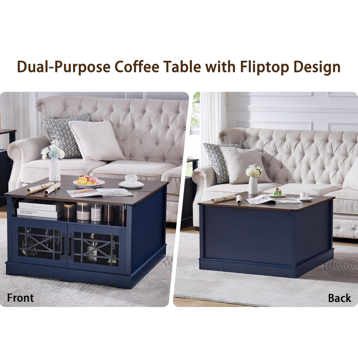 Square Coffee Table Farmhouse Coffee Tables for Living Room, Coffee Table with Storage, Blue Coffee Table with Hidden Compartment, Rustic Center Table with Lift-up Top
