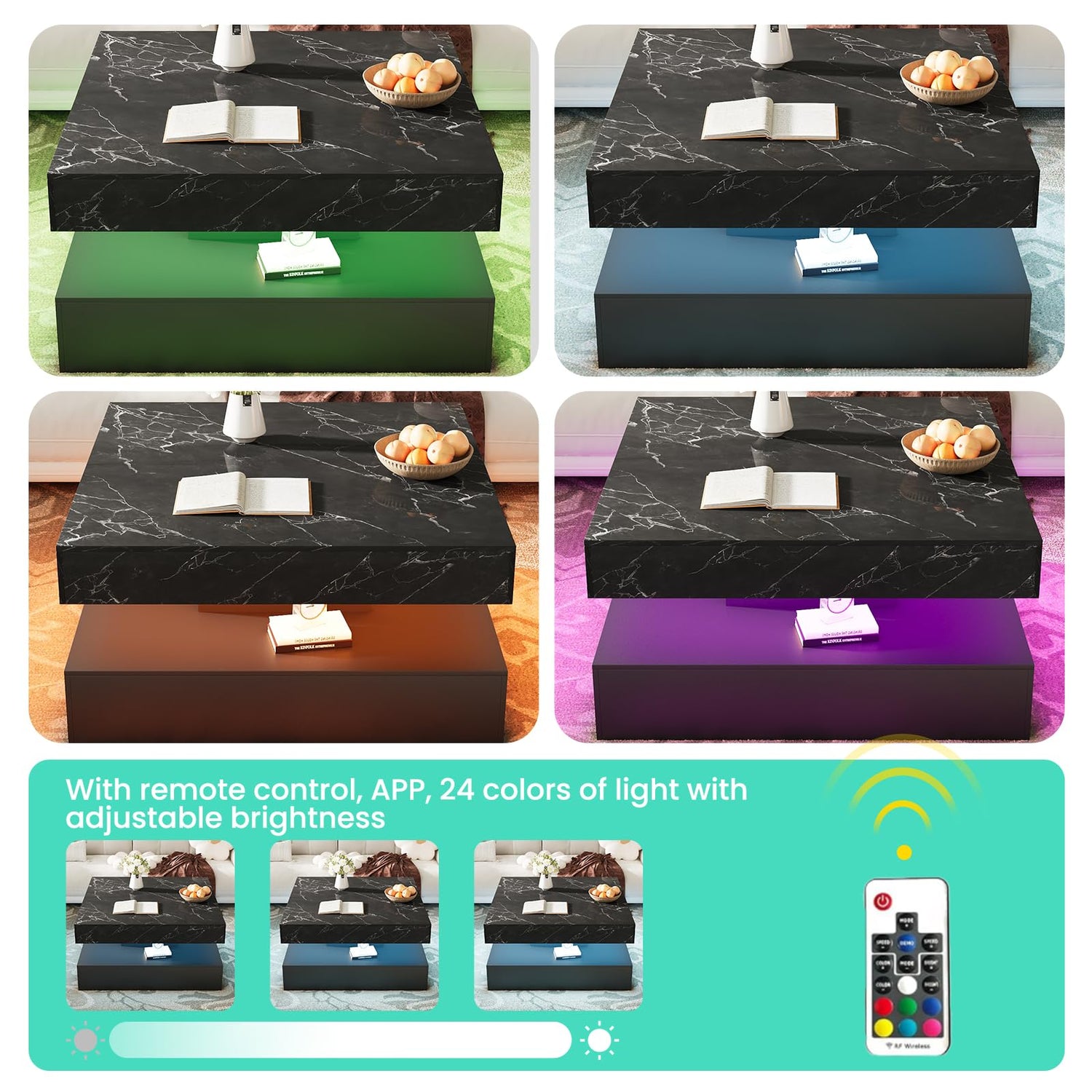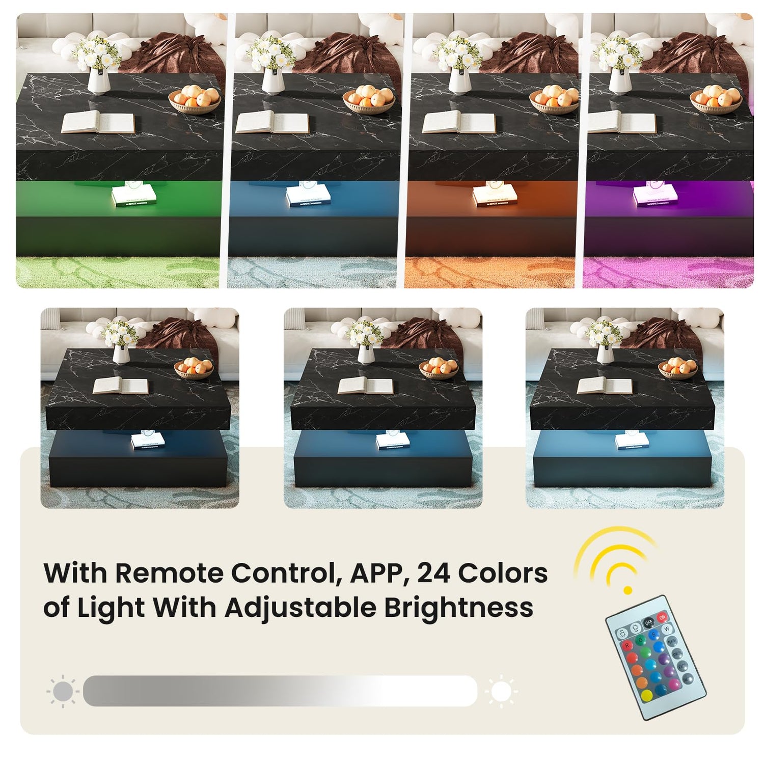 - 【Modern Black Glossy LED Coffee Table with Sturdy Construction】This square modern coffee table is crafted from premium wood with a marble-patterned high-gloss waterproof surface, offering both elegance and durability. Thanks to its sturdy structure, selected materials, and excellent craftsmanship, this black LED coffee table is built to last, making it a stylish and reliable addition to your living room.