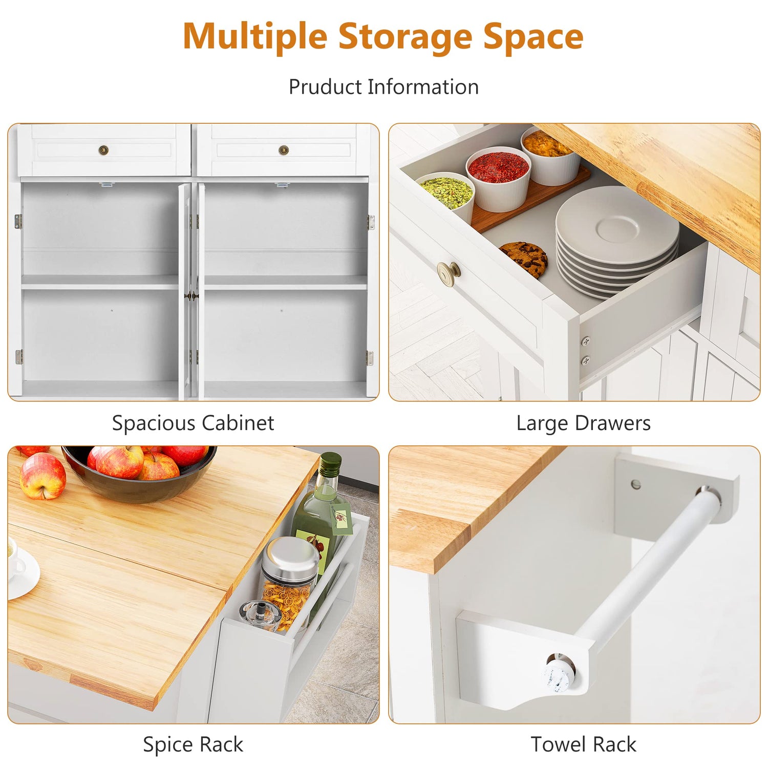 Squireewo Kitchen Cart with Wood Top and Drop Leaf Breakfast Bar, Rolling Mobile Kitchen Island Table on Wheels with Drawer and Storage Cabinet, Spice Rack, Towel Rack, White