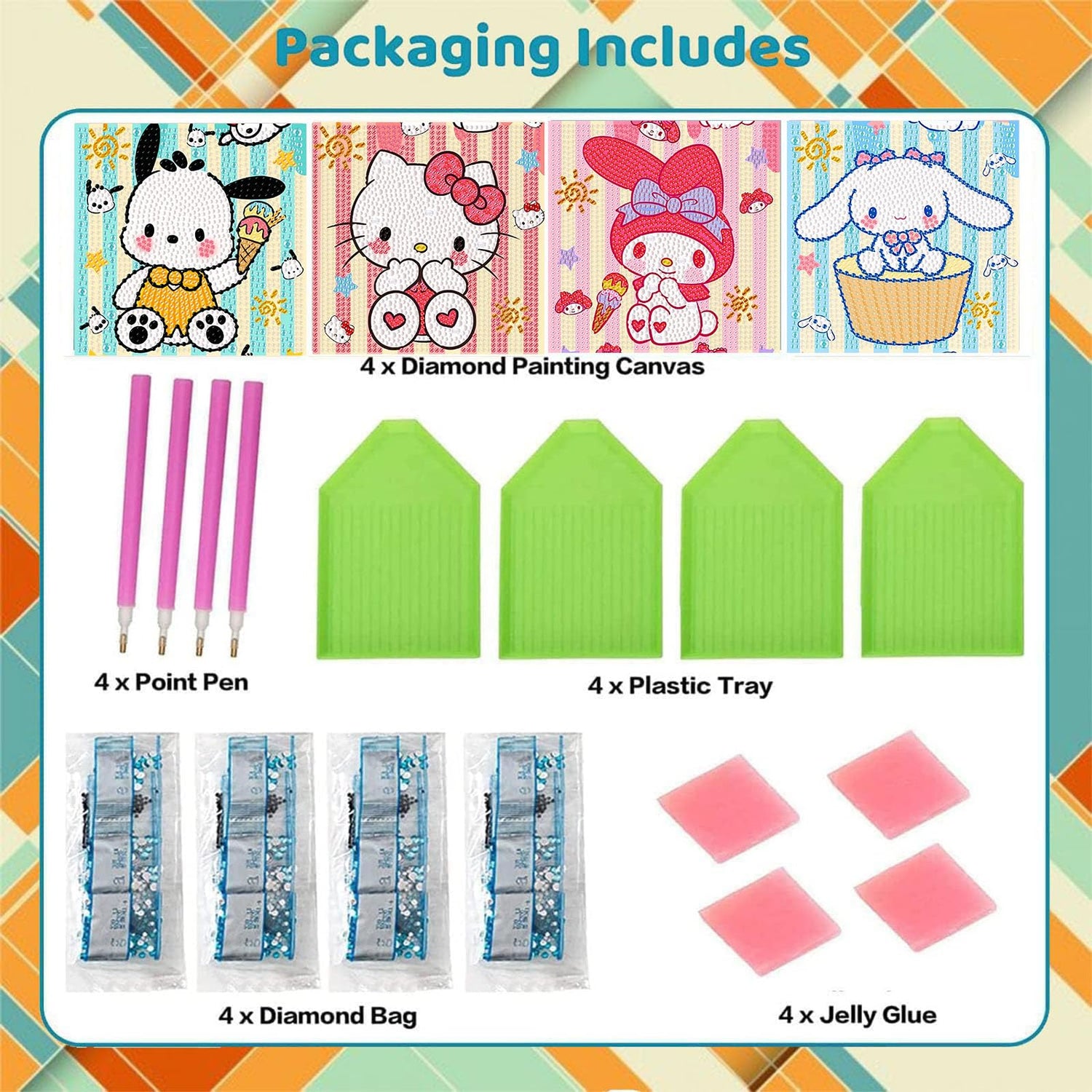 - IMPECCAble CRAFTSMANSHIP: The 4-pack diamond art painting kits for kids are crafted with top-notch quality. Each kit includes all necessary tools: a high-quality fully drilled canvas with a printed legend, a diamond pen, a diamond tray, red glue, plastic bags for diamonds, and over 30% extra colored round diamonds.