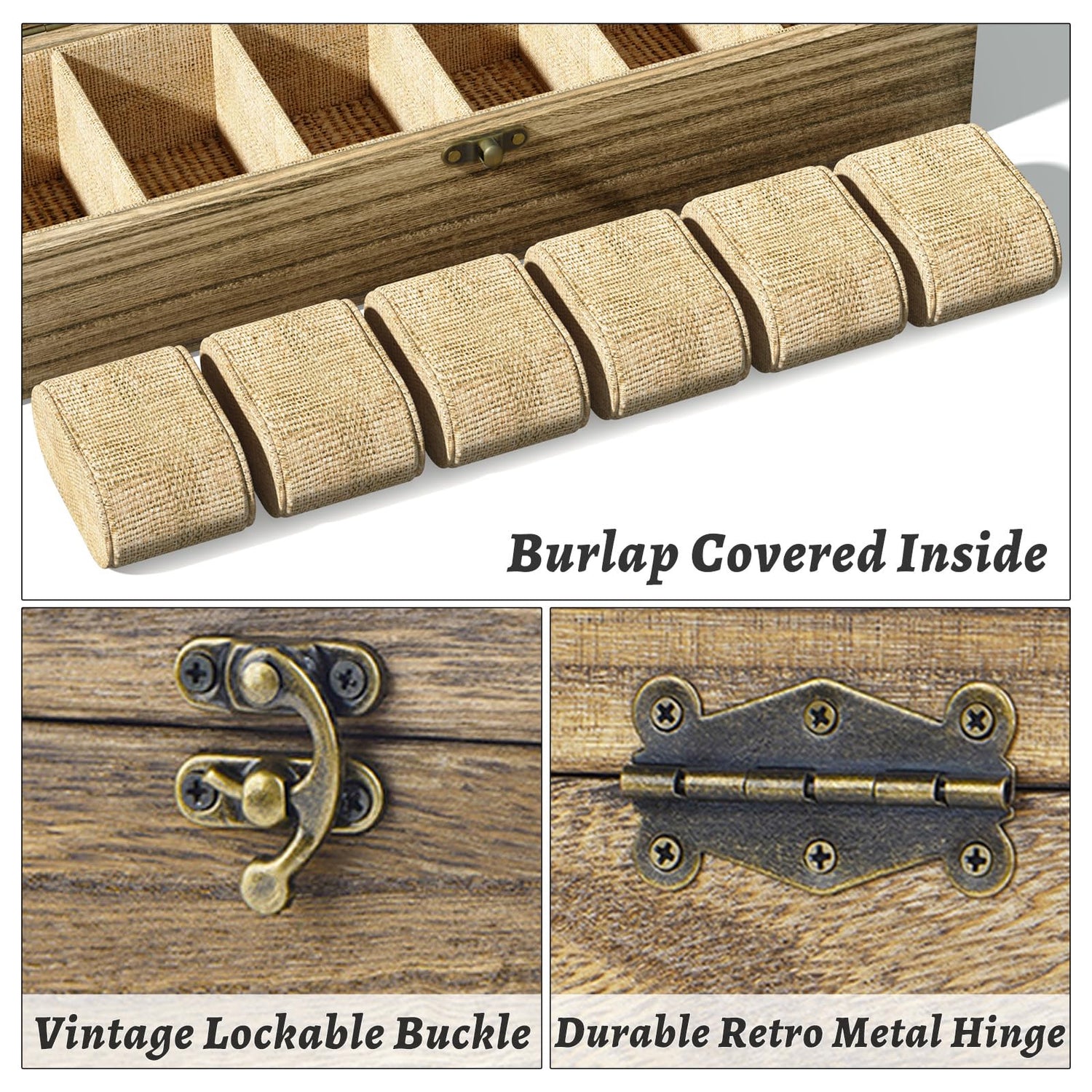 - Rustic But Elegant - Authentic wood design, well crafted, classy latch, clear glass lid, and the burlap material used inside the case and the watch pillow, such a retro rustic watch box is better than the faux leather cases everybody else is selling.