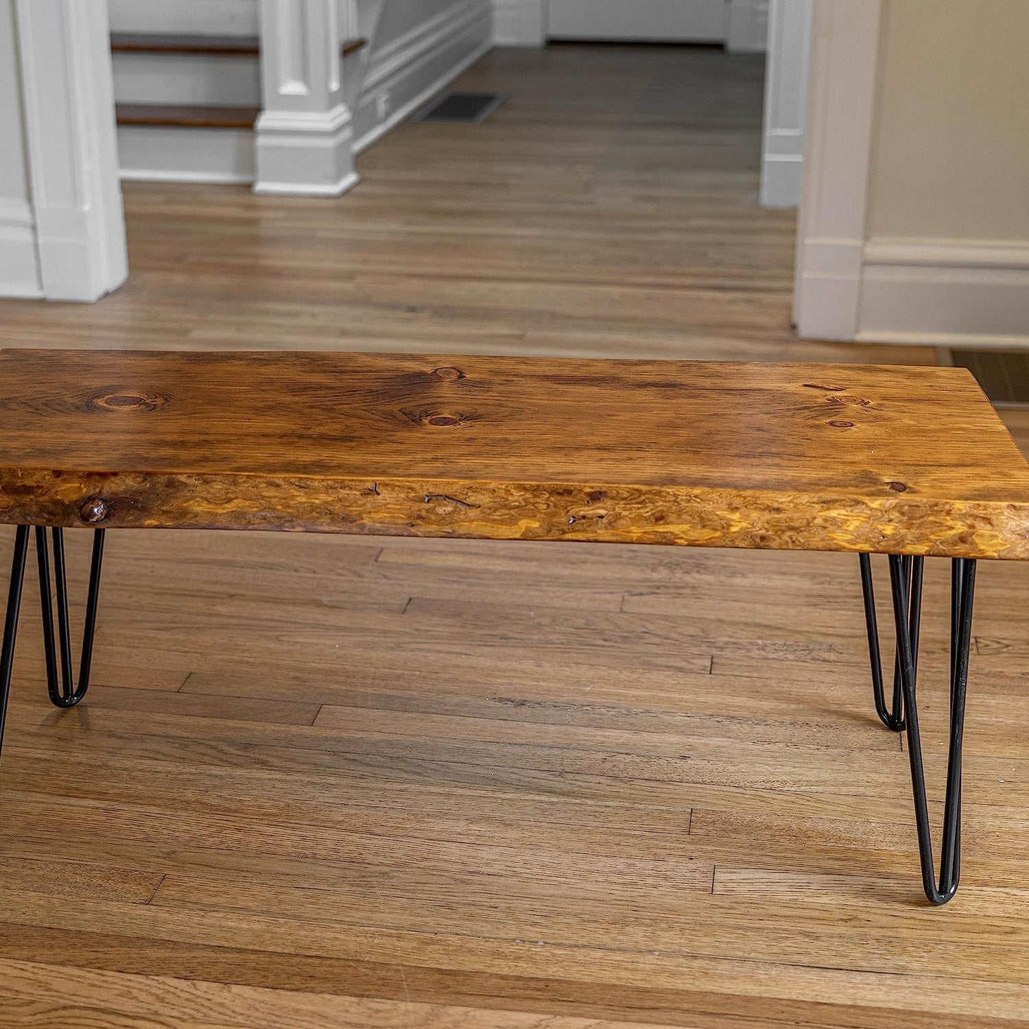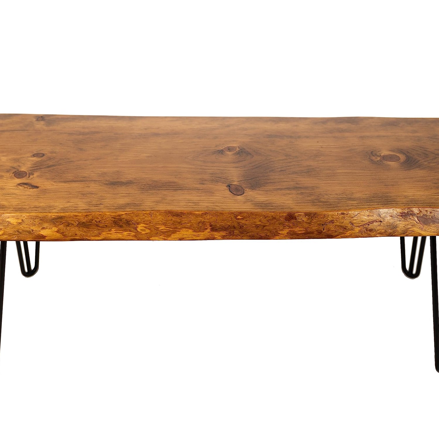 - The hairpin legs come in two color options, black or unfinished steel. The table is offered in a darker honey pine or natural clear finish with 2 live edges. This coffee table will also work perfectly in any entryway, mudroom, covered patio, or bedroom.