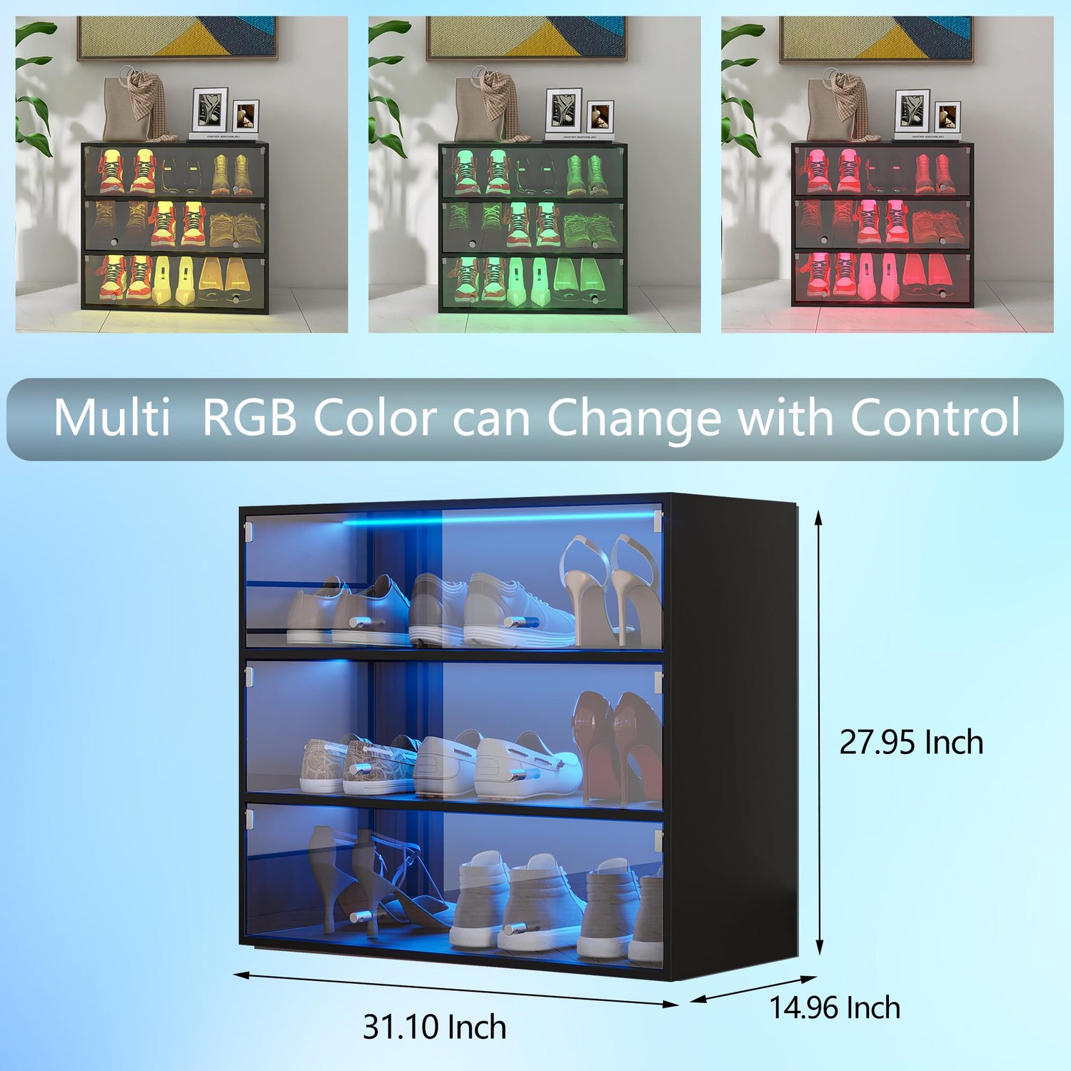 Stackable Sneaker Storage with LED Lights for Up to 9 Pairs of Shoes, Three Layers Shoe Rack with Thick Glass Door, Clear Shoe Boxes Sleek Wooden Showing Shoe Rack for Space Saving, Black