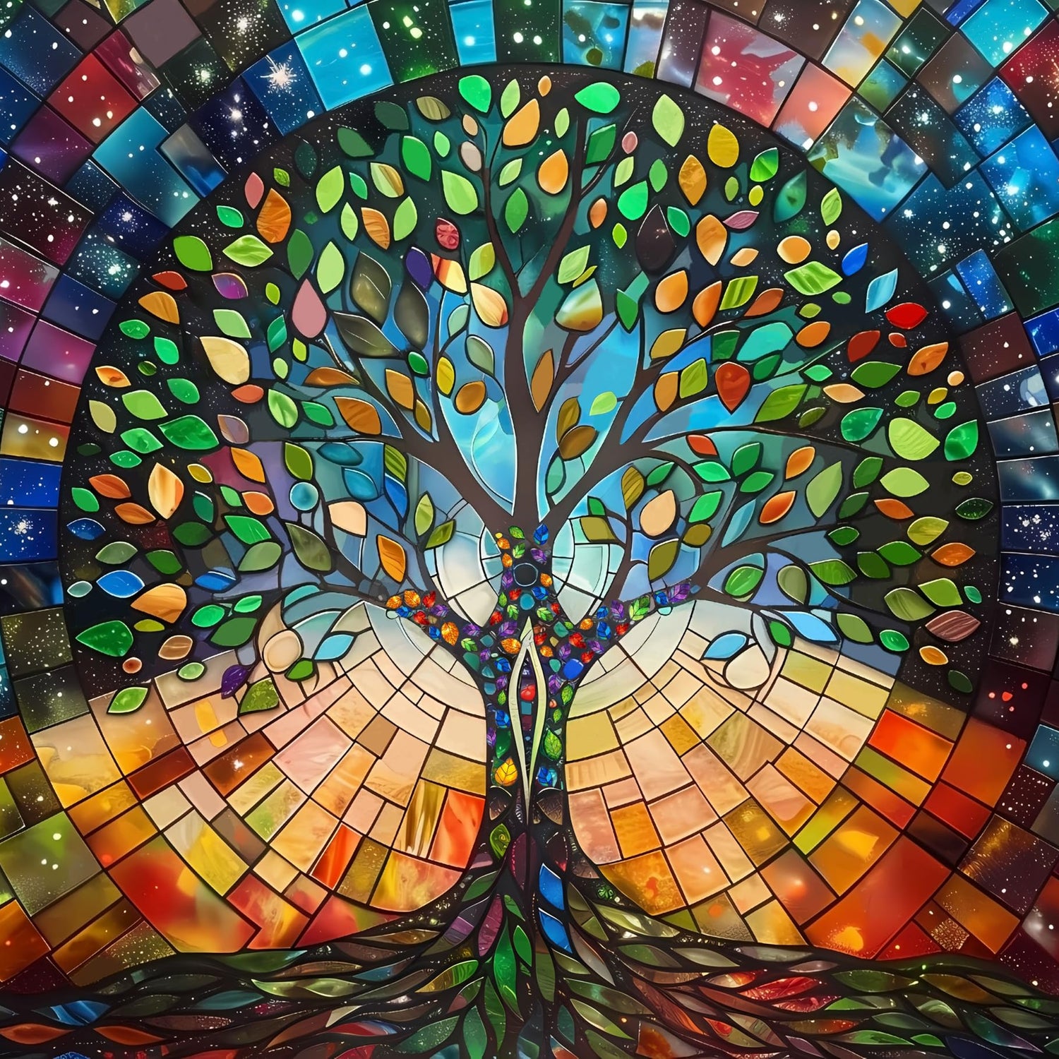 - Discover the Enchanting Colors: Experience the vibrant beauty of our Stained Glass Tree of Life puzzle. This stunning artwork features a mosaic of colorful leaves against a shimmering starry night sky, creating a captivating visual experience