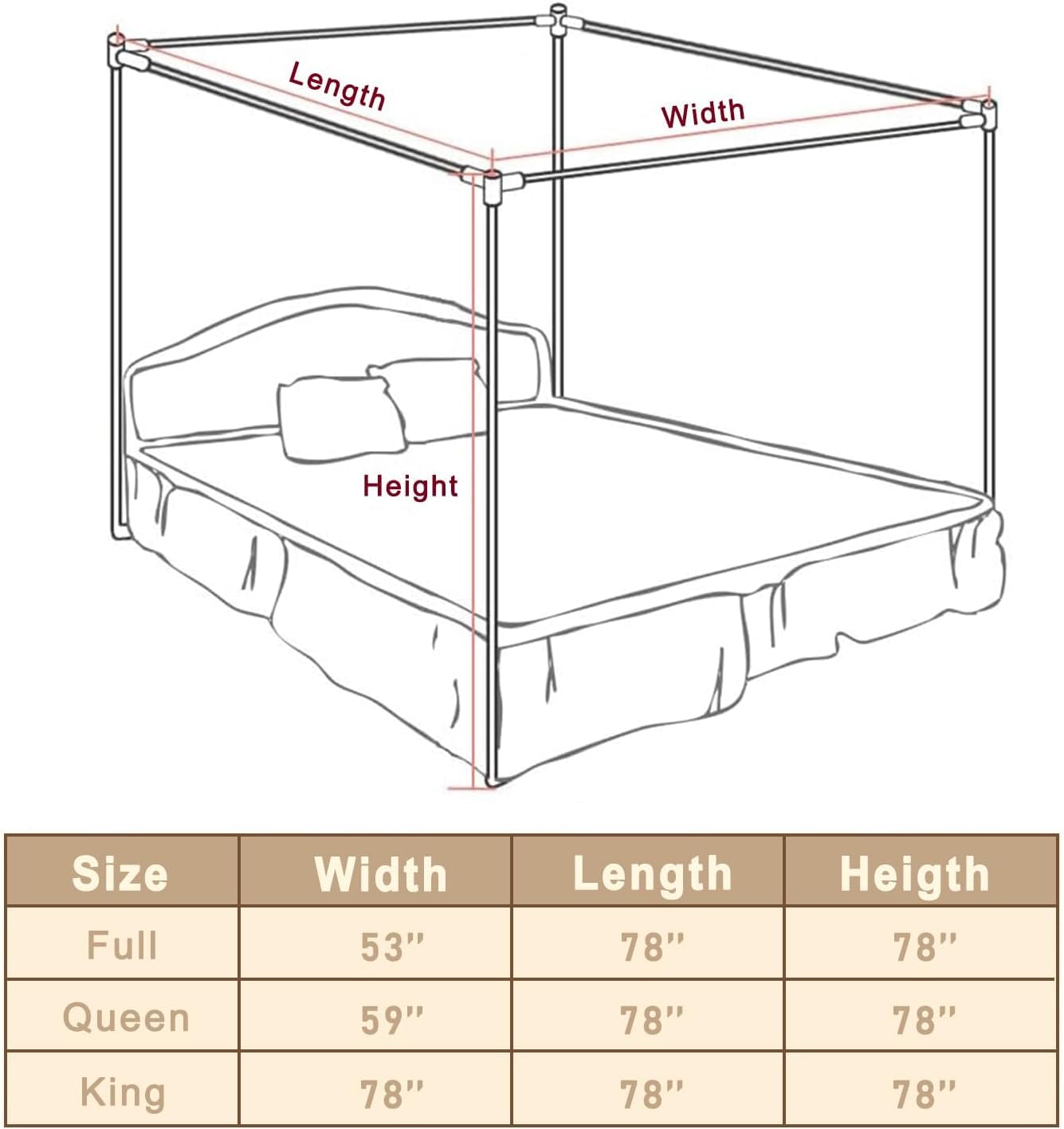- 【Thickened Canopy Bed Frame Size】Full Size: 53" X 78" X 78". Queen Size: 59" x 78" x 78". King Size: 78" x 78" x 78". Metal connectors: make the bed frame more firm, not wobbly. Used to connect height poles, length poles and width poles.