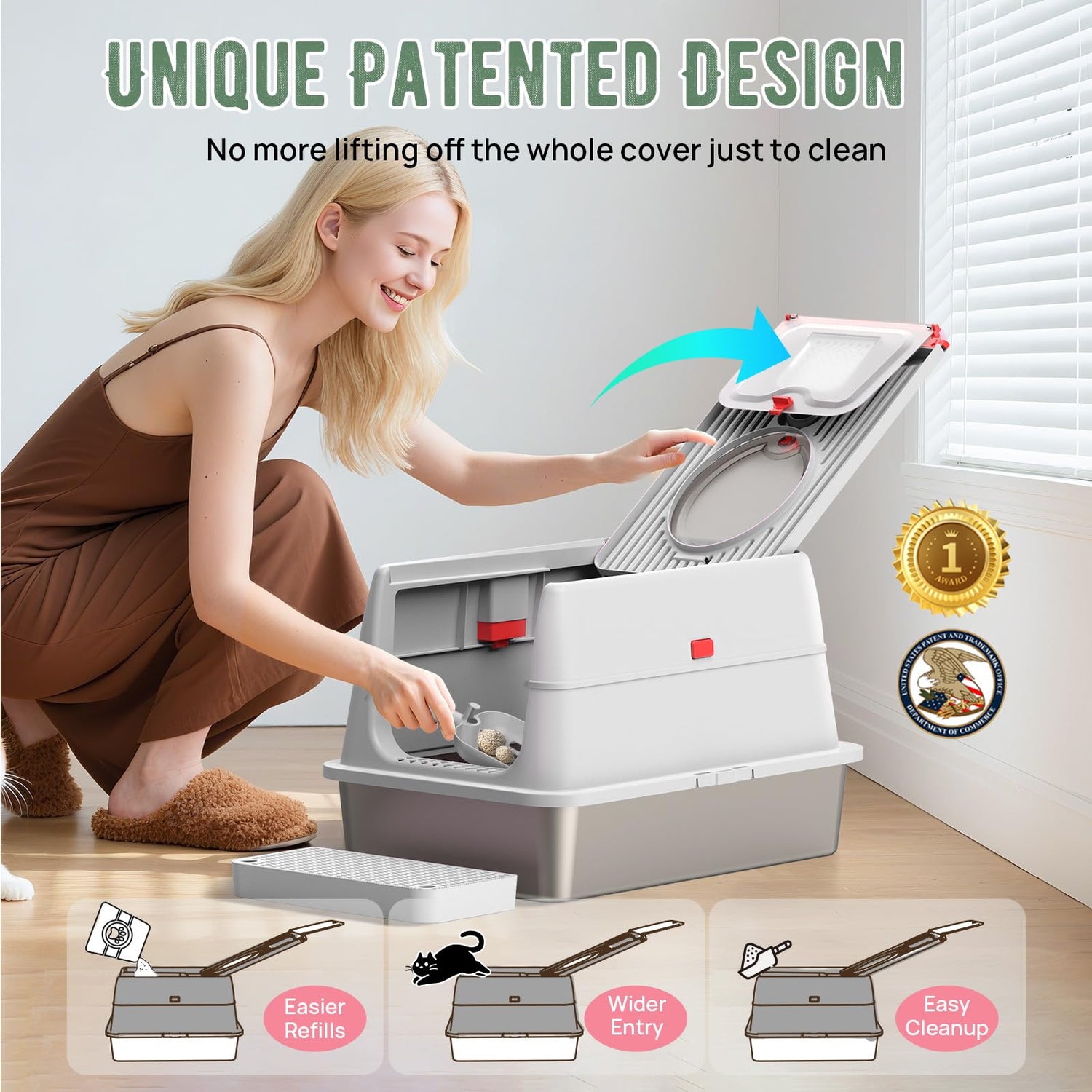 Stainless Steel Cat Litter Box: Enclosed Cat Litter Boxes with Lid - Extra Large Metal Kitty Litterbox with High Sides Top Entry XL Litter Pan Tray for Big Cats Anti-Leakage