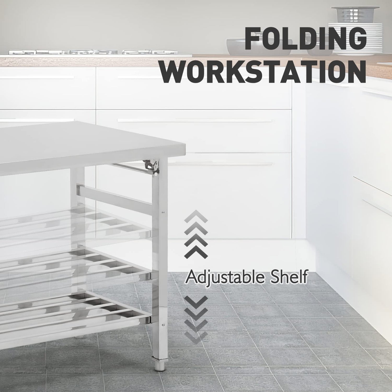 Details: Stainless Steel Workbench is an ideal choice for home and commercial kitchens. The stainless steel surface is easy to clean and disinfect, and can easily wipe and protect desktop stains. Foldable design, stainless steel work table can be folded up when not in use, without occupying kitchen space.