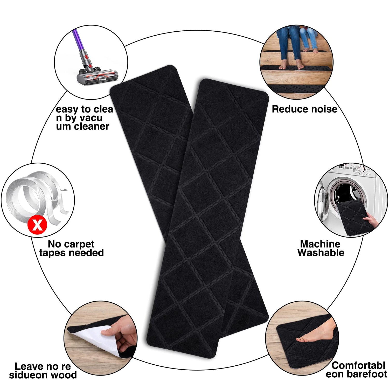 - ❤Washable & Reusable - Step treads are durable and stain-resistant. Dust, paper scraps, and pet hair can be cleaned with a vacuum cleaner. Also, Carpet stair treads are hand wash or machine wash. If you’d like to wash stair covers for carpeted stairs, wash in cold with mild detergent and then replace the carpet for stairs after natural drying and will feel and look like new!