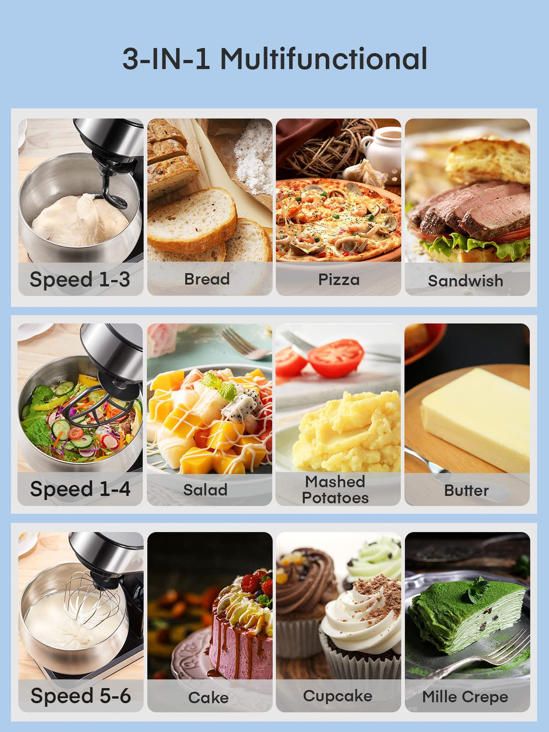 - Lift Up Efficiency and Mix More Thoroughly: No more tired of preparing things!With this 600w stand mixer, you can mix bread dough, thick batters, meringues, and whip cake cream just in a few minutes. Its planetary mixing action ensures that each attachment rotates around the entire bowl as it spins at your selected speed and provides complete bowl coverage. Ingredients will be mixed more thoroughly.