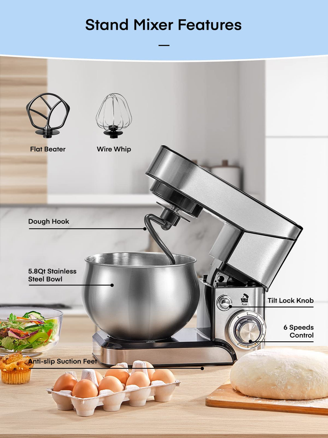 Stand Mixer FOHERE, 5.8 QT Stainless Steel Mixer with Dough Hook, Mixing Beater, Wire Whip, Dishwasher-safe, 6+P Speeds Tilt-Head Kitchen Dough Mixers for Cake, Electric Home Cooking Kitchen Mixer