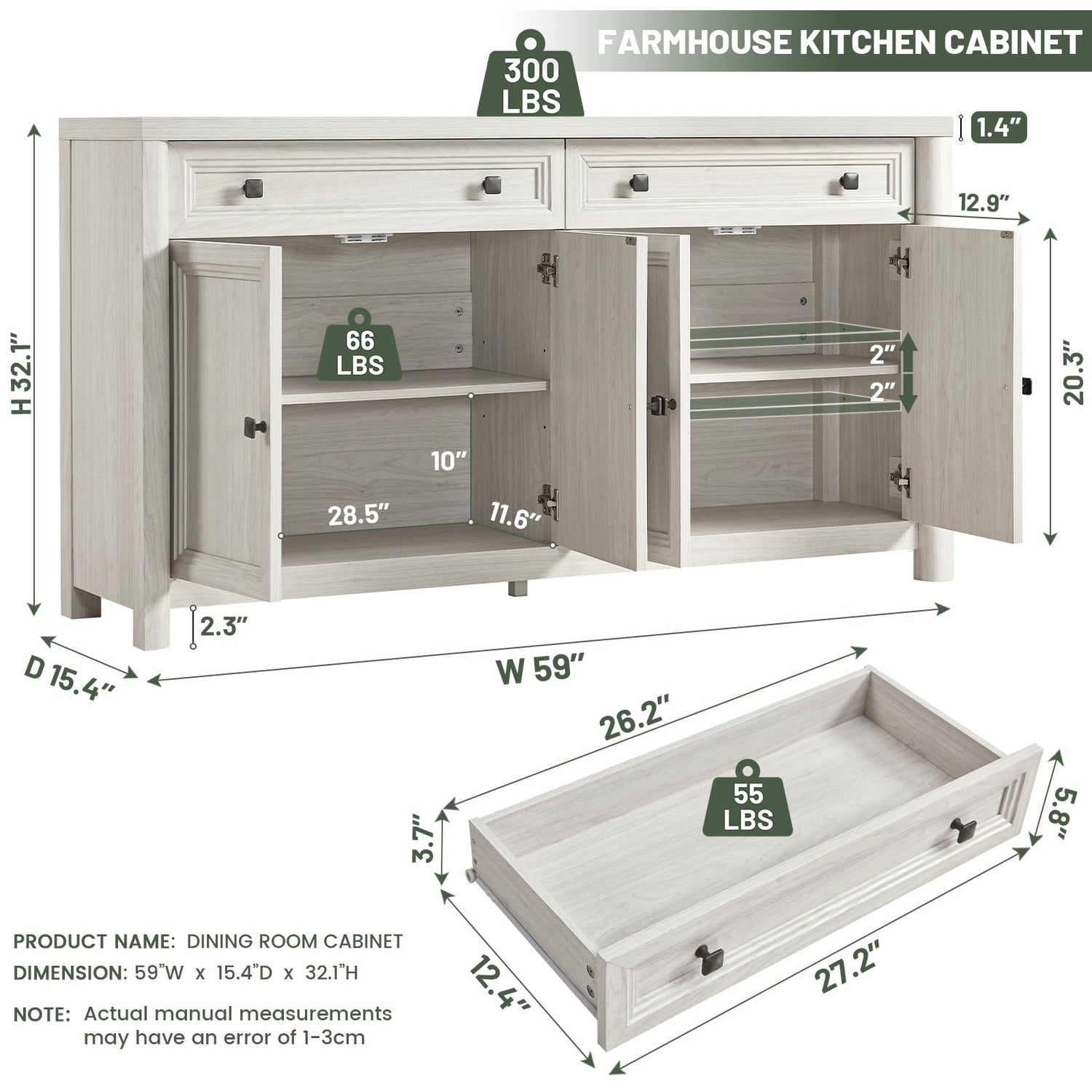 - Large Storage Cabinet: Say goodbye to kitchen and dining room clutter with our farmhouse versatile buffet cabinet. The washed white sideboard buffet cabinet has a 59 inch ultra wide tabletop, which is perfect for placing appliances such as coffee beans, tableware, microwave, toaster or coffee makers. With 2 handy drawers, 4 doors cabinets, inside, you'll discover each deep side cabinet with an adjustable shelf that can accommodate items of various sizes flexibly