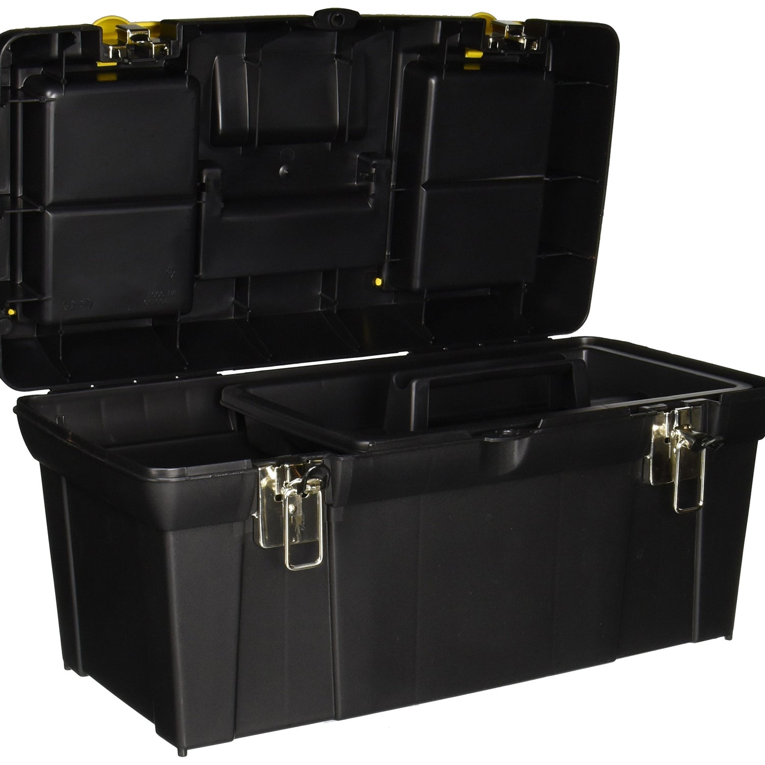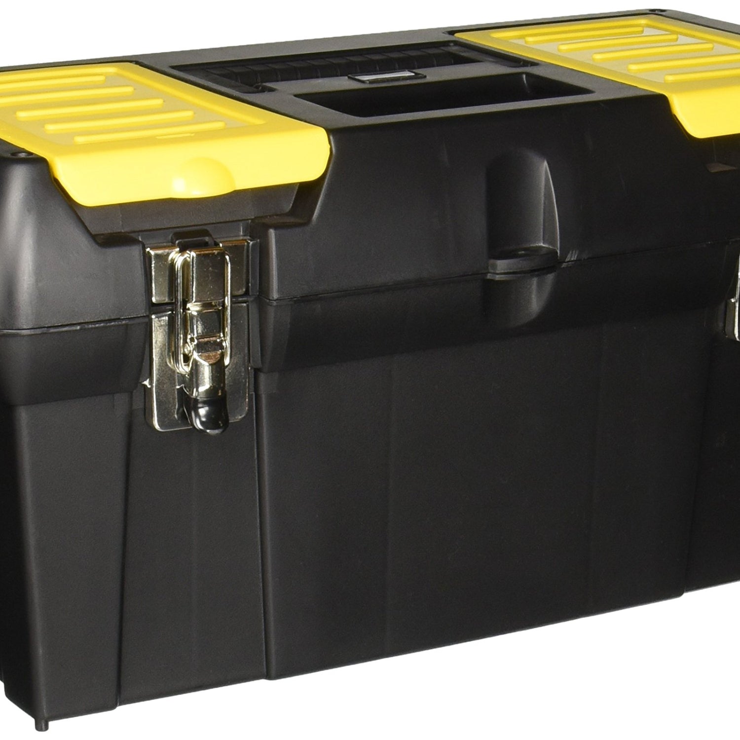 Details: The Stanley 019151M 19-inch Series 2000 Tool Box with Tray features two lid organizers for small parts storage – accessible without opening the tool box, with a tote tray inside to store smaller items. This unit has a built-in pad lock eye for small locks to keep contents secure. The soft, wide rubber coated handle allows for easy & comfortable grip. This storage box also features nickel metal-plated latches.