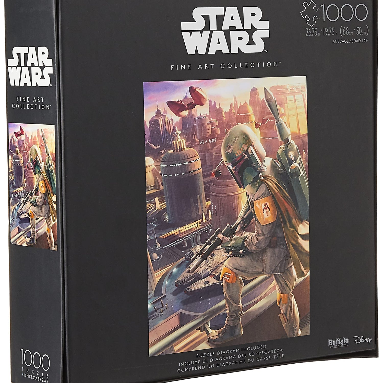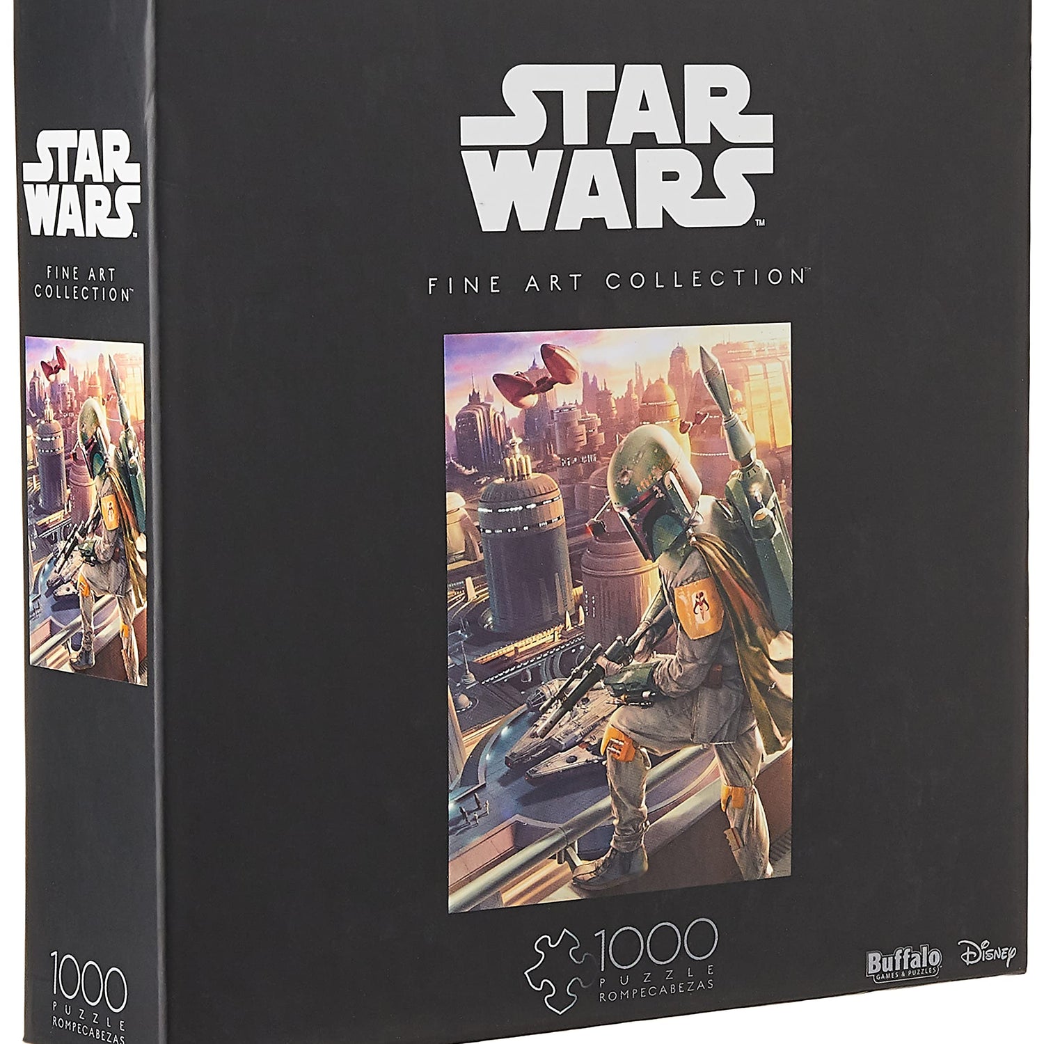 Details: The 1000 Piece Star Wars Fine Art Collection Puzzle Series is crafted for the Star Wars fan. It features Star Wars Fine Art that captures the spirit and moments of all your favorite characters. This puzzle features Boba Fett, the famed bounty hunter, tracking Han Solo, Princess Leia, Chewbacca and C-3PO as they exit the Millennium Falcon below on Cloud City. Each image has been carefully selected to create a satisfying puzzle experience - right down to the last piece! Every Buffalo Games jigsaw puzzle is manufactured using premium quality 100% recycled paperboard. s signature Perfect Snap™. A bonus puzzle poster is also included so that you have a handy reference of what the completed puzzle should look like while you put yours together.