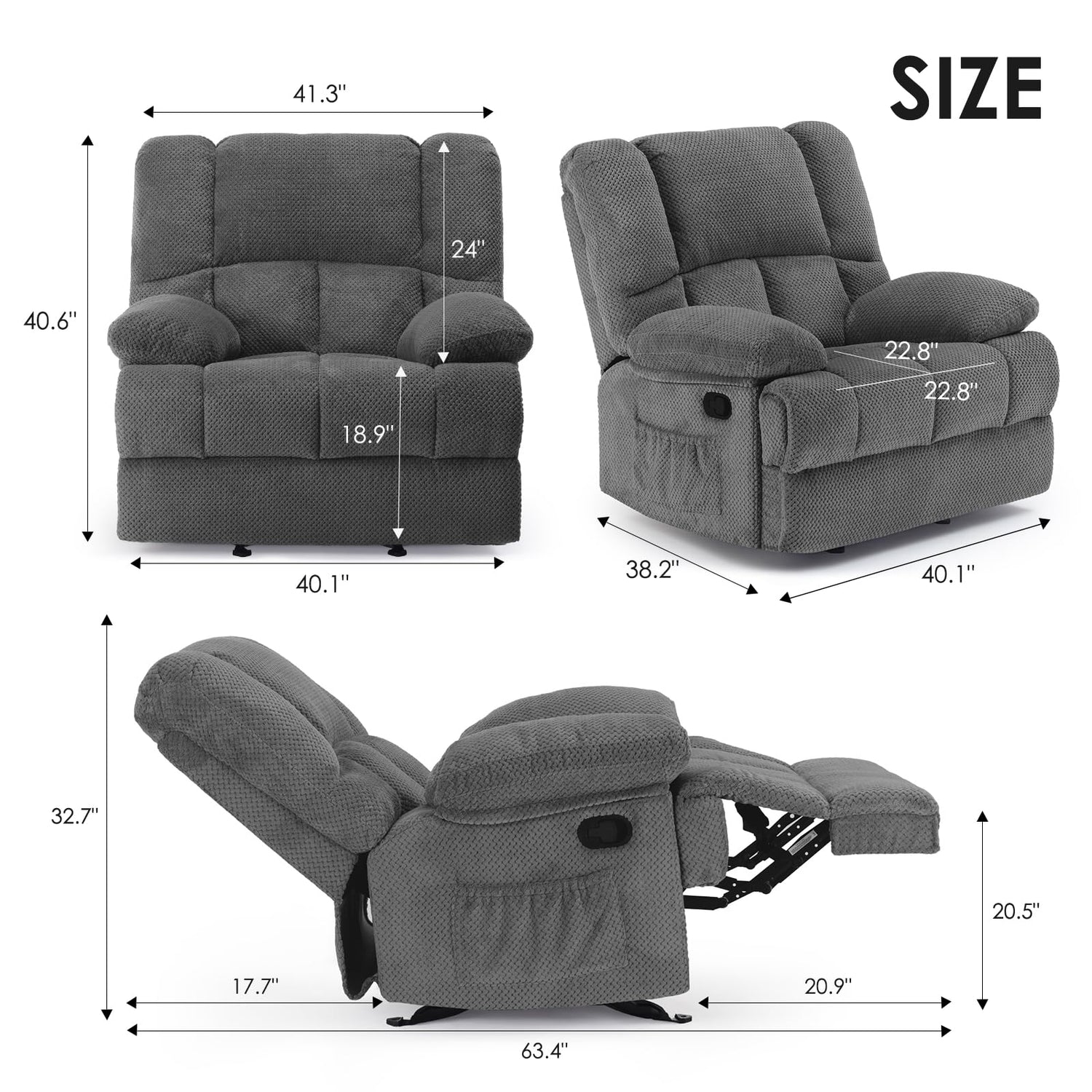 - OVERSIZED RECLINER CHAIR FOR ADULTS:This oversized recliner chair overall dimension is 40.1"(L) x 38.2"(W) x 40.6"(H),seat size is 22.8"(L) x 22.8"(W). Particularly suitable for use in living rooms or bedroom. Kindly please confirm the size before buying.Weight capacity of up to 350 lbs